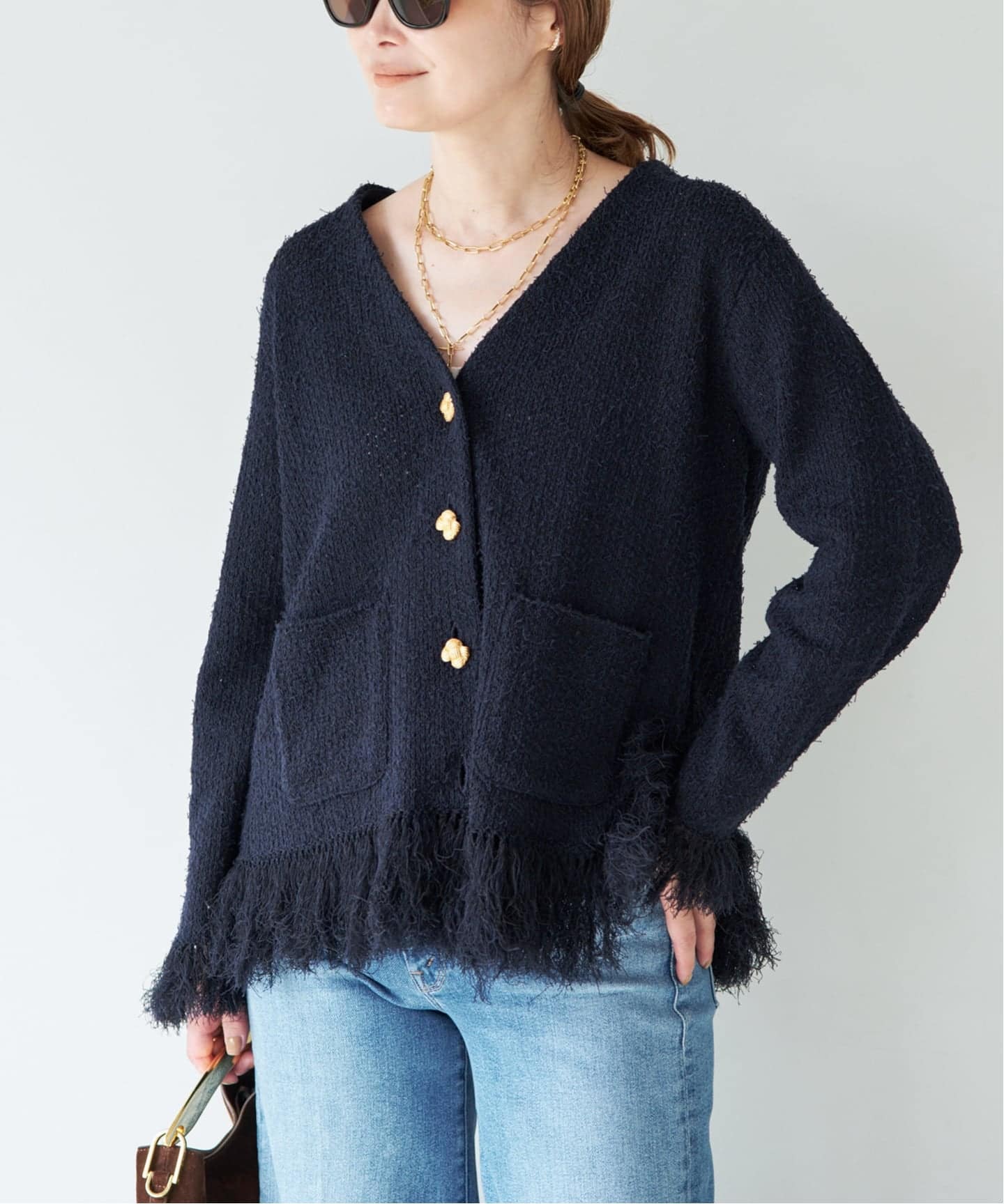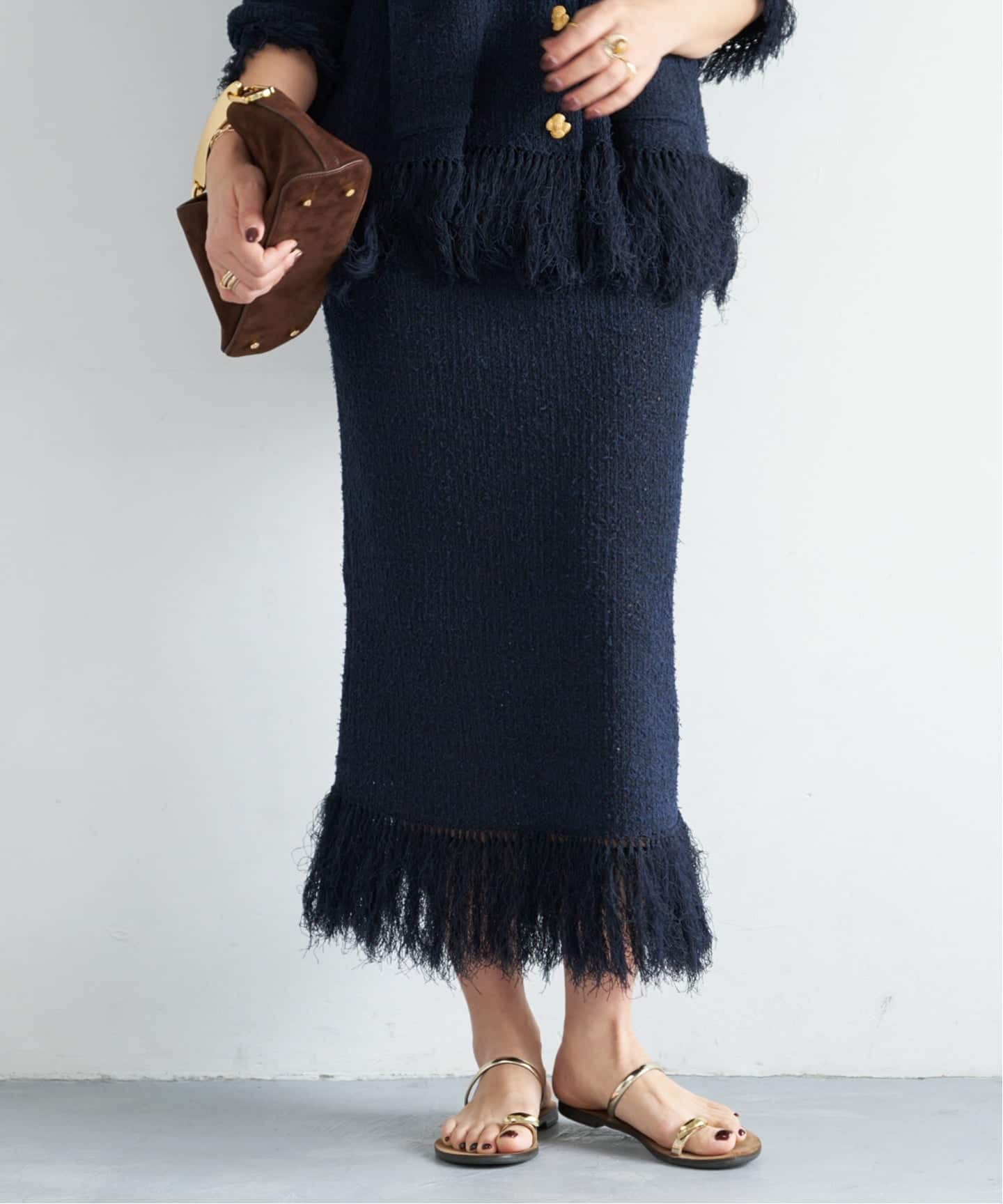 異なる3種類の糸をMIXしたオリジナルのニットツィード。奥深いネイビーに揺れるフリンジが軽やかで華やかな表情に。