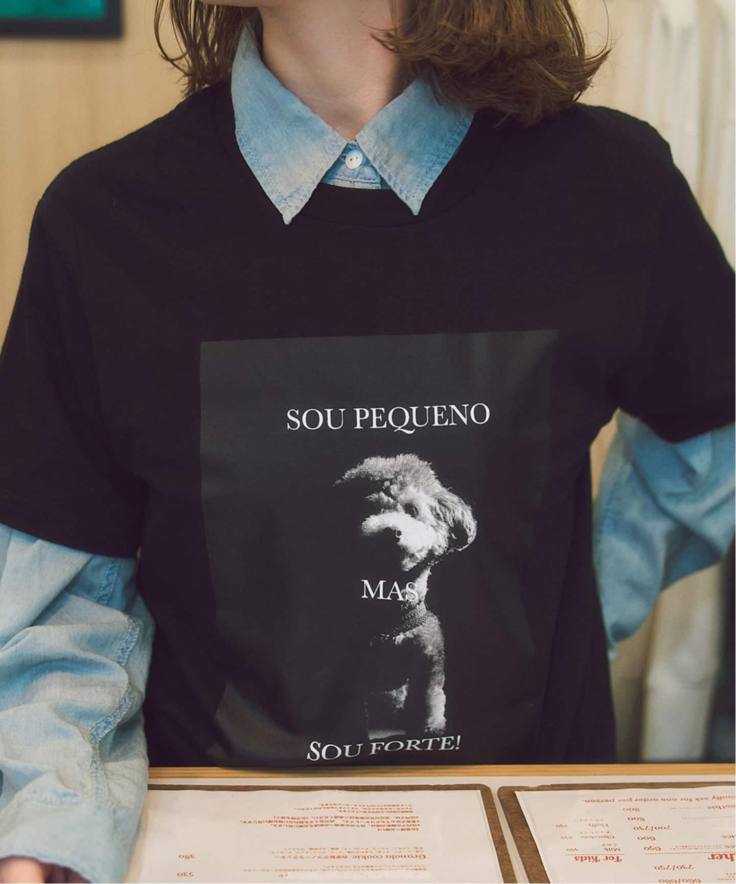 Spick & Span バイヤー柏木と、オーナーの織田さん、バリスタのレオさんとの日常会話から生まれた今回の企画。二匹の愛犬「オリバー」と「ゴマちゃん」をモチーフにデザインしました。レオさんがSpick別注で描き下ろしたオリジナルグラフィックは、織田さんのファッション経験を活かし、カラー展開やサイズ感まで丁寧に調整。愛らしいキャラクターと遊び心あふれるデザインが、日常のカジュアルコーデに映える一枚です。