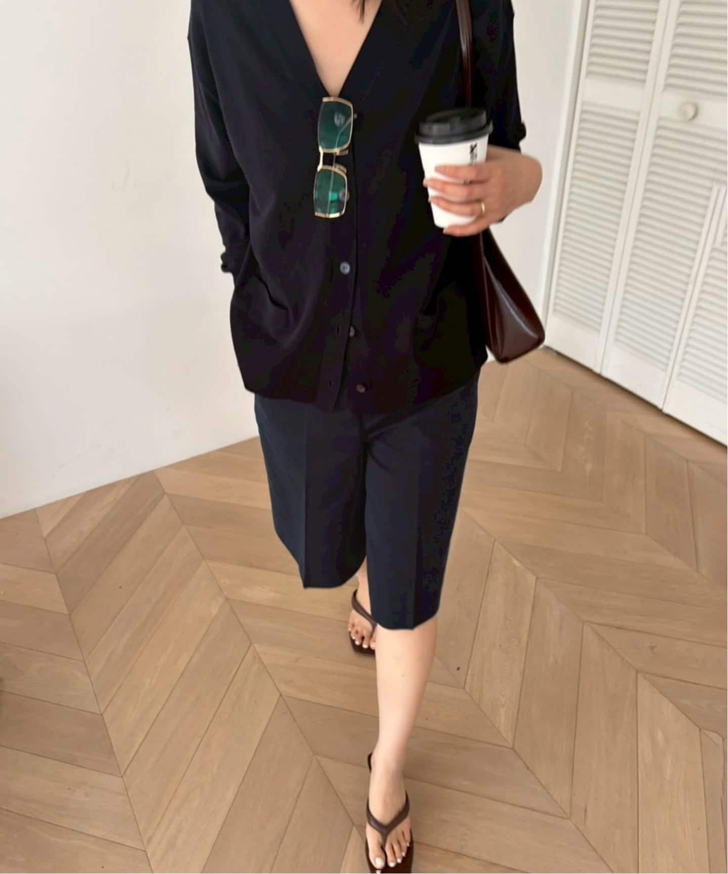 着回し力の高いシンプルなカーディガンですが、フロントのパールボタンがさりげなくスタイリングに華やかさをプラスしてくれます。