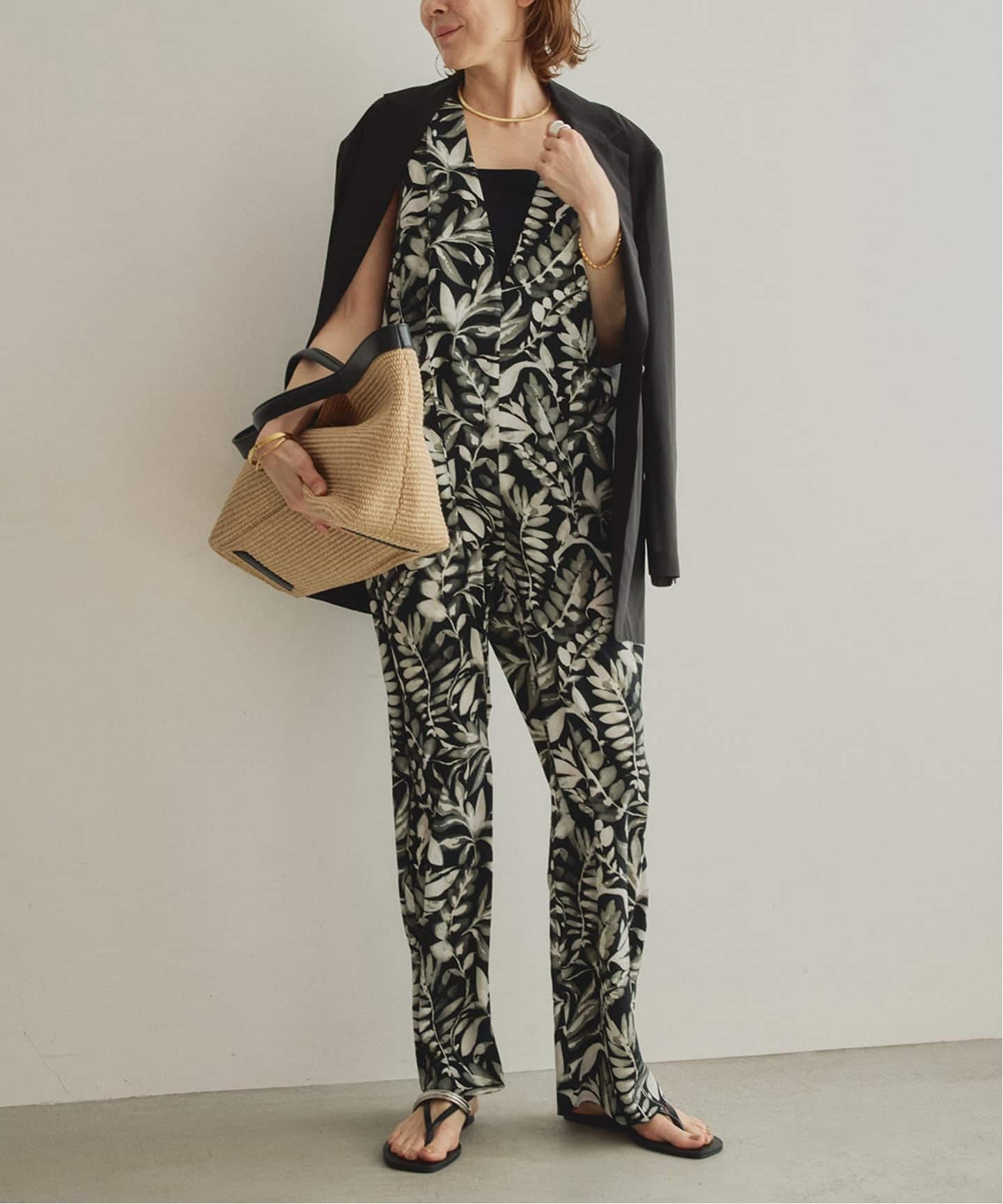 グラフィカルなボタニカル柄を、直線と落ち感で構成したオールインワン。