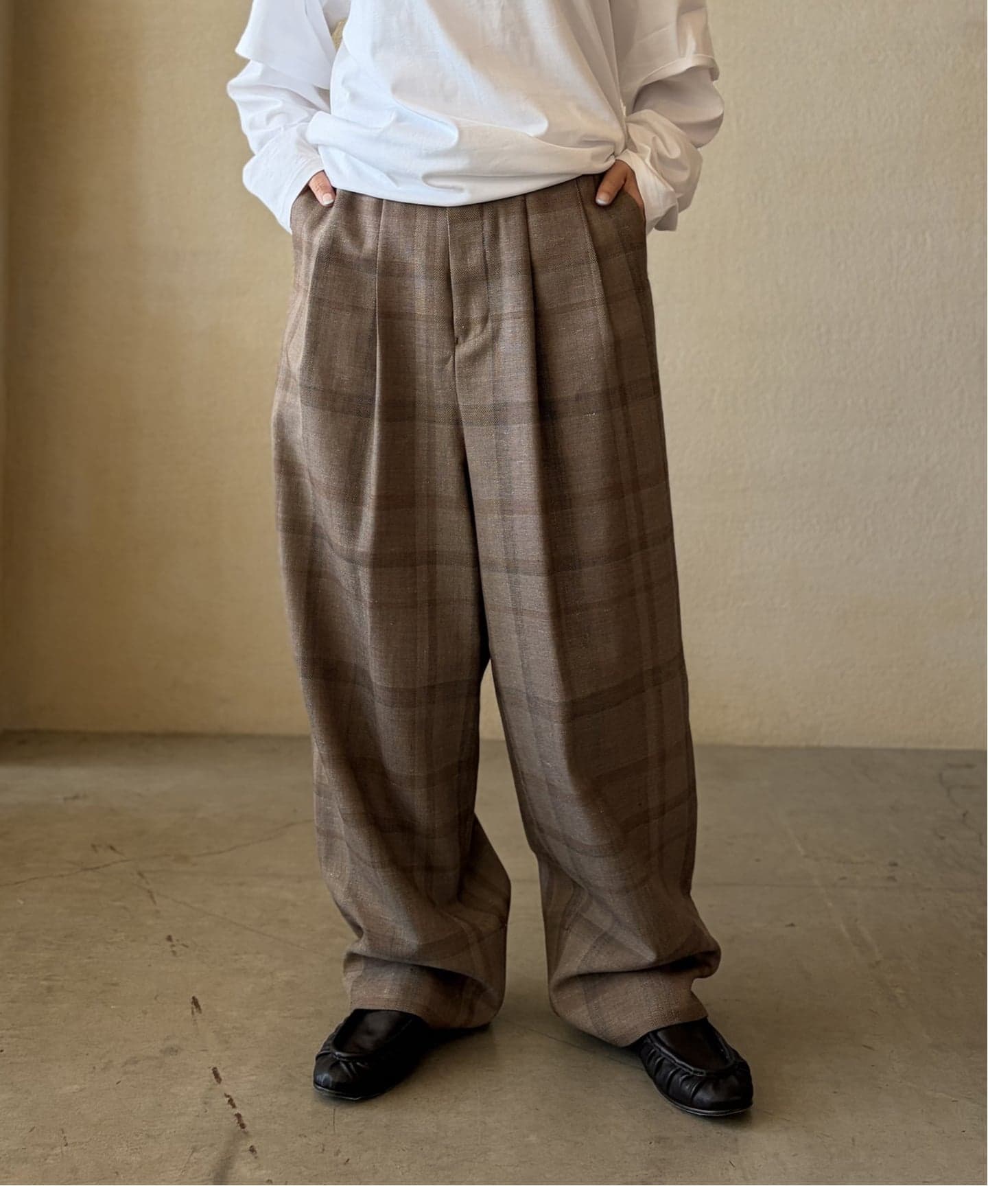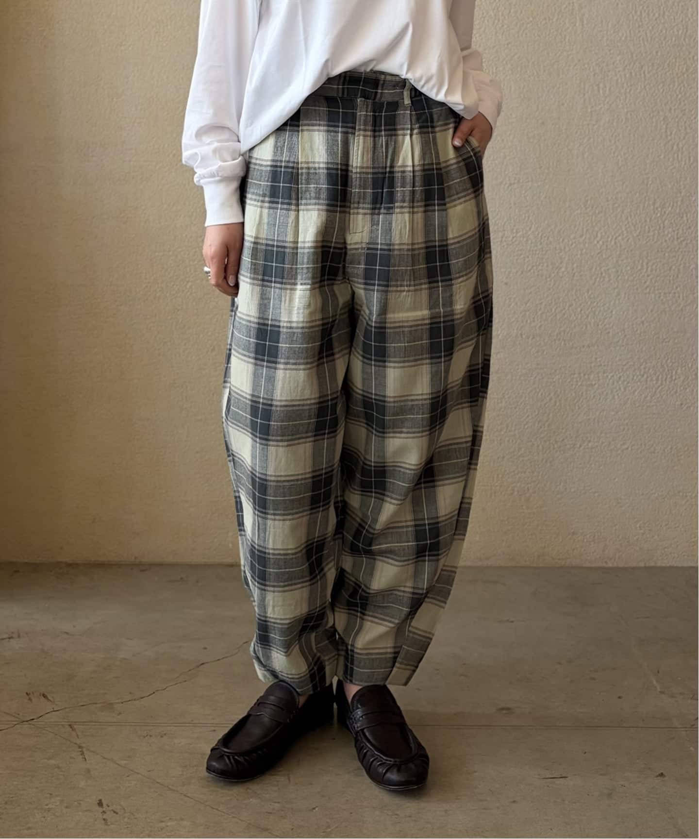 シャツと同素材のタックパンツ。セットアップでの着用もおすすめ。(身長165cm・サイズ3着用)