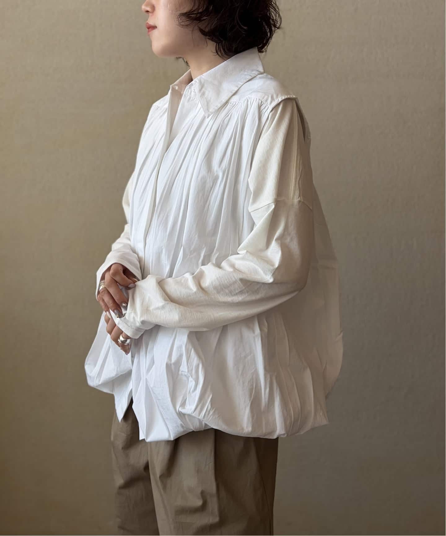 前後にたっぷりと配置したギャザーが特徴のスリーブレスシャツ。昨年も人気のモデルで、SIZE40をリクエストしました。