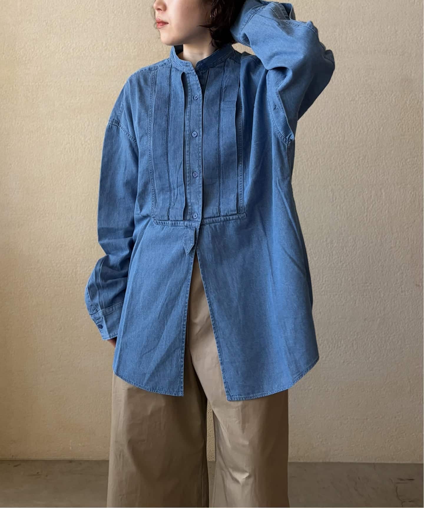 洗いをかけたインド綿のライトオンスデニム素材の、プル型タキシードシャツ。
