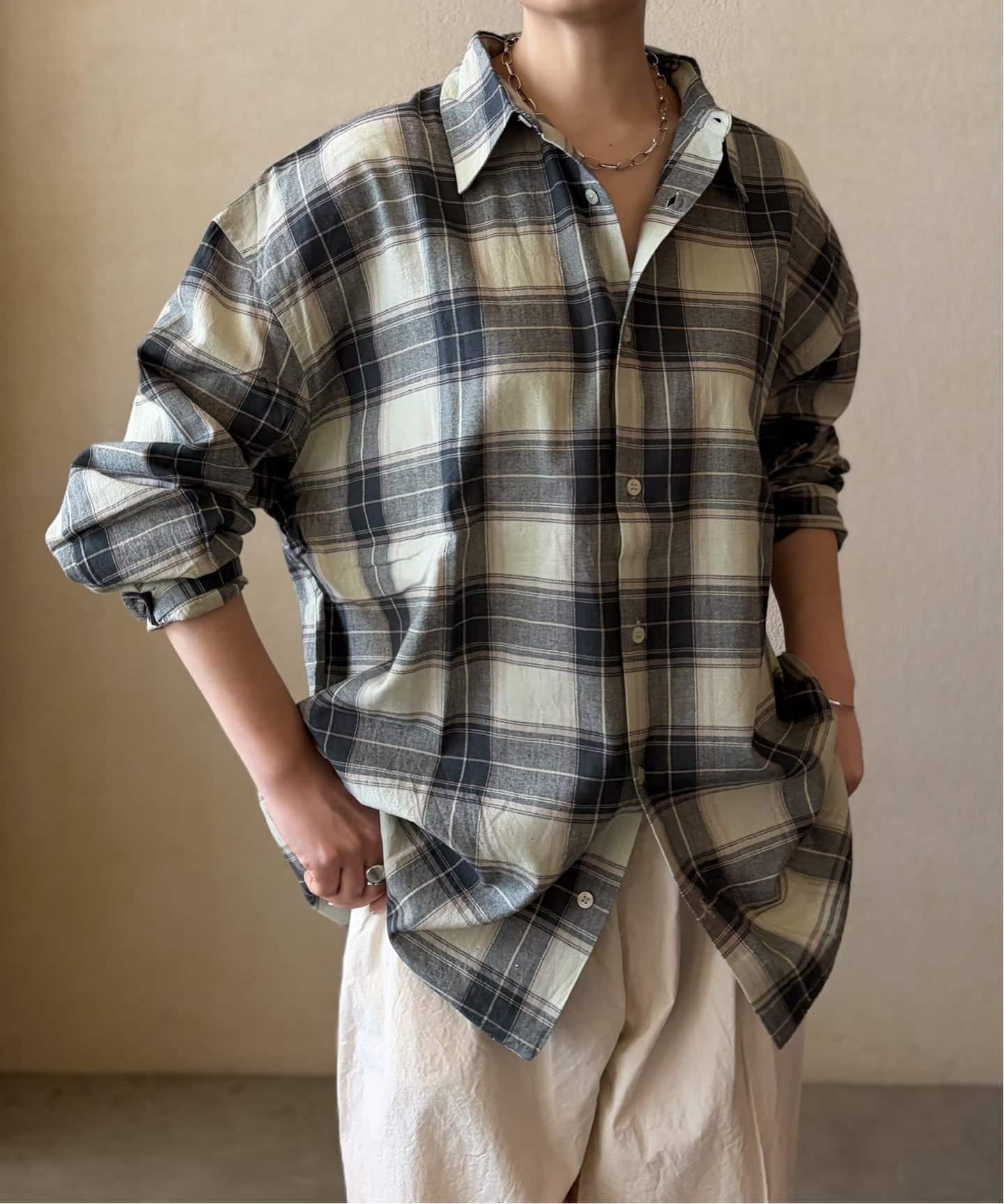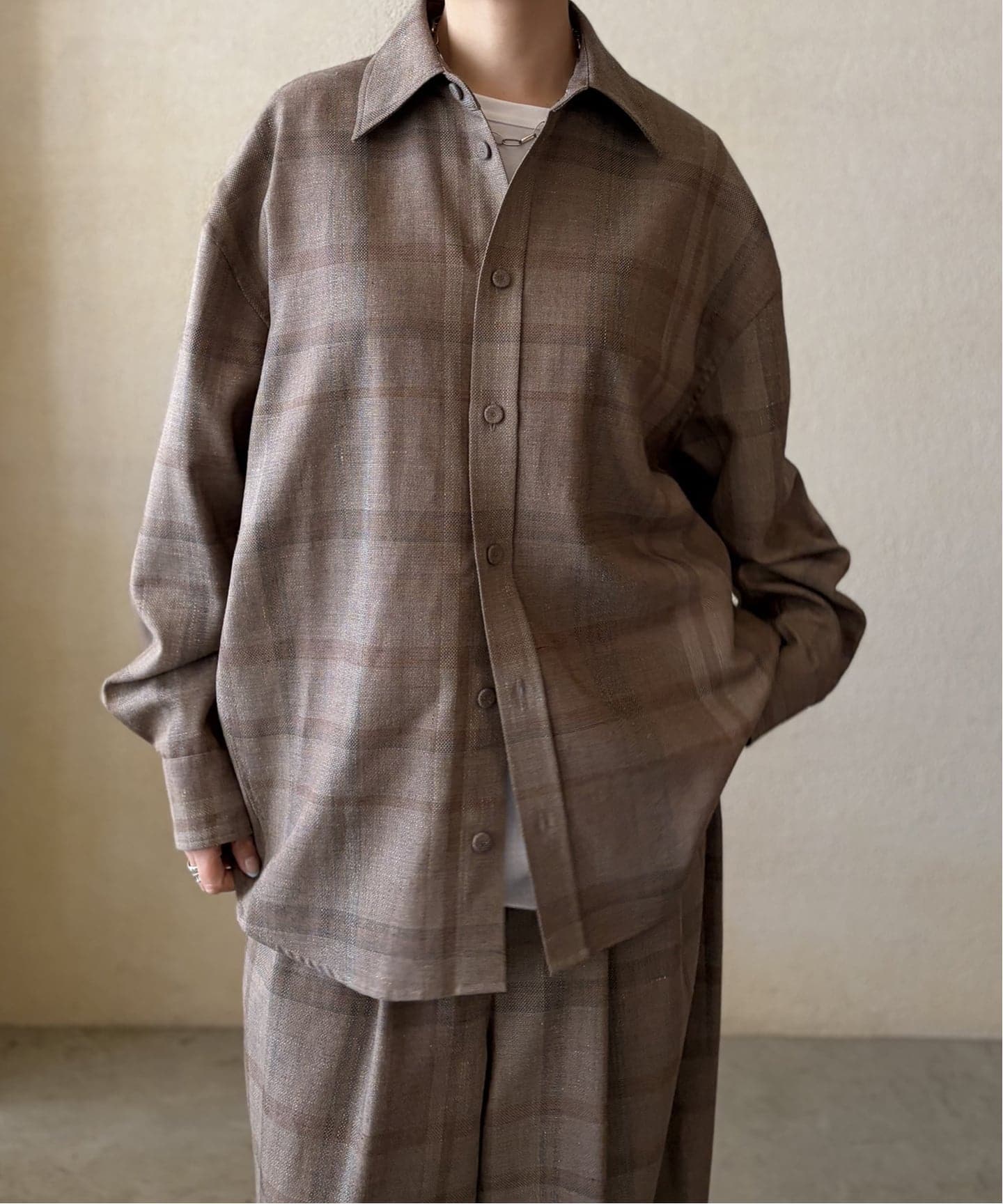 シーズナル素材の、ウールリネン強撚マルチチェック。ウール麻糸とウール糸の2種類を組み合わせて制作した生地を使用した、オーバーサイズシャツ。