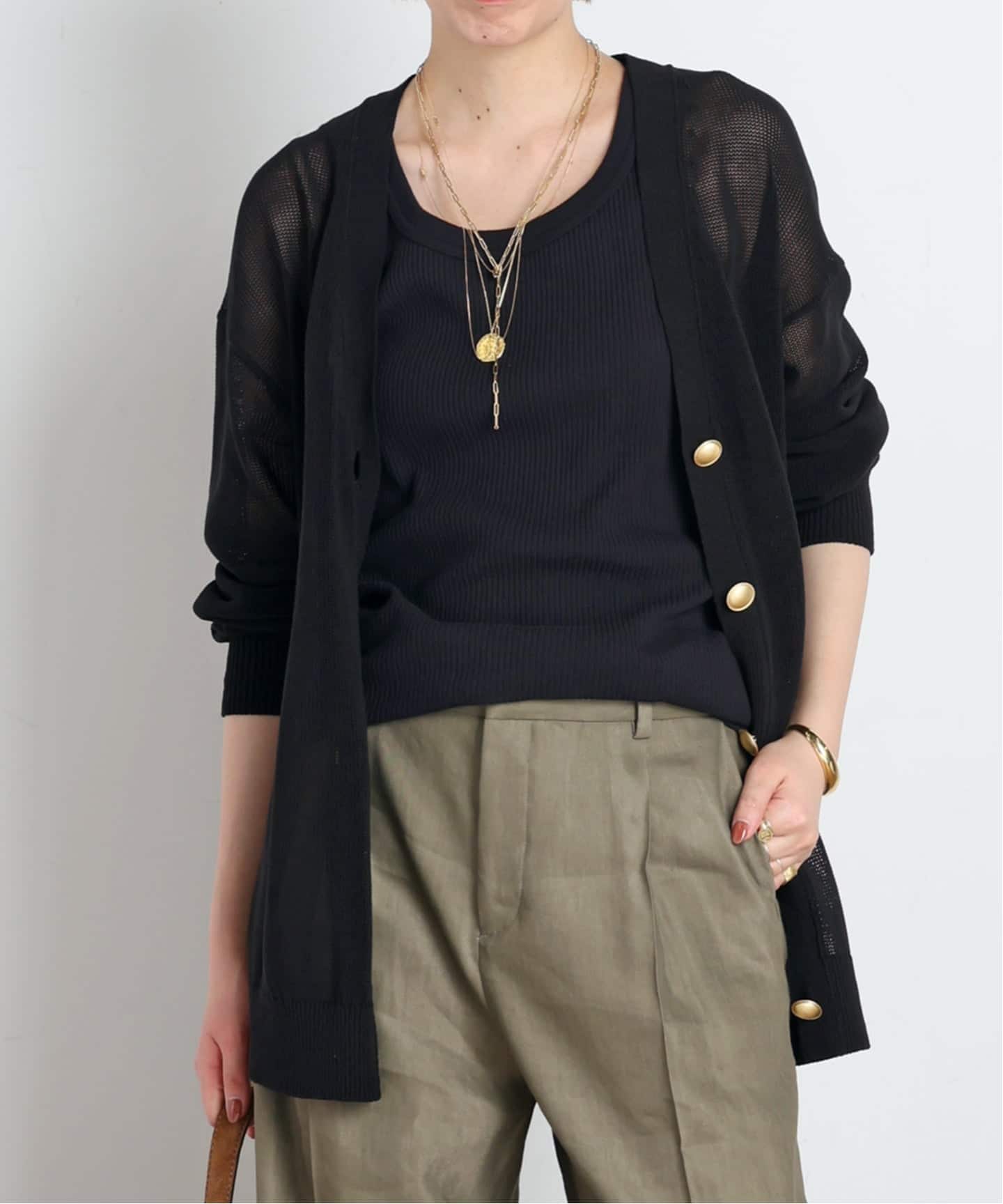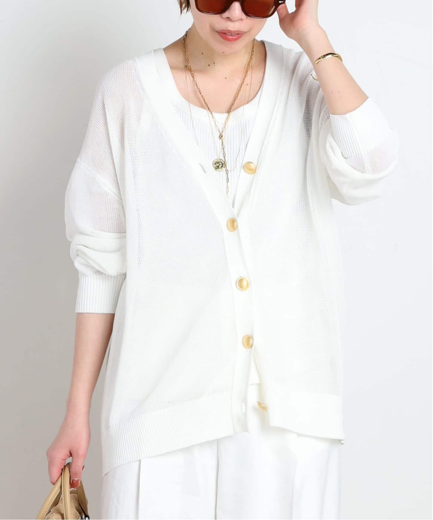 金ボタンがアクセントになったニットカーディガン。