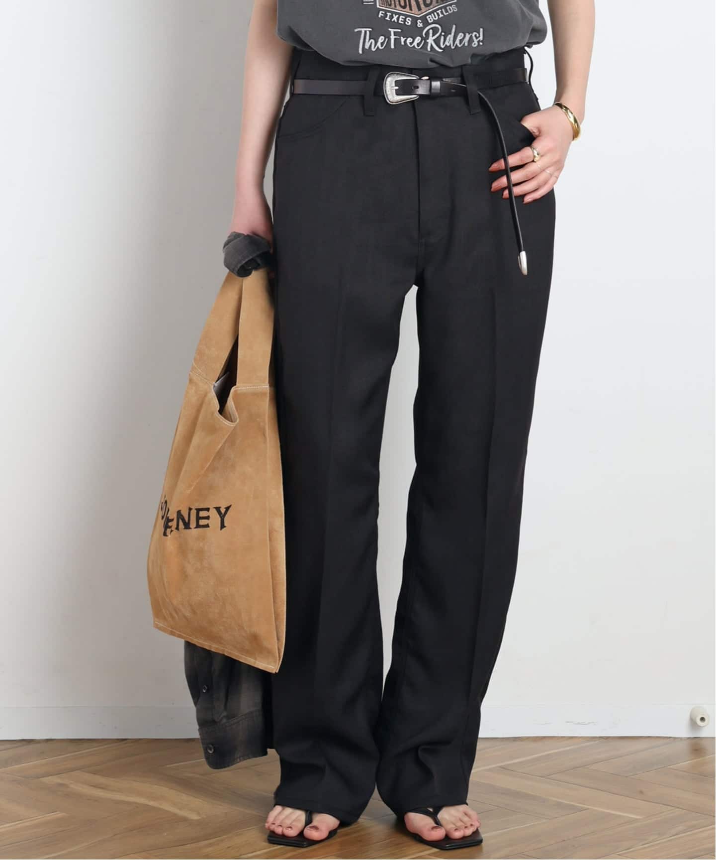 センタープレスが施され、裾に向かって広がるフレアシルエットが特徴。