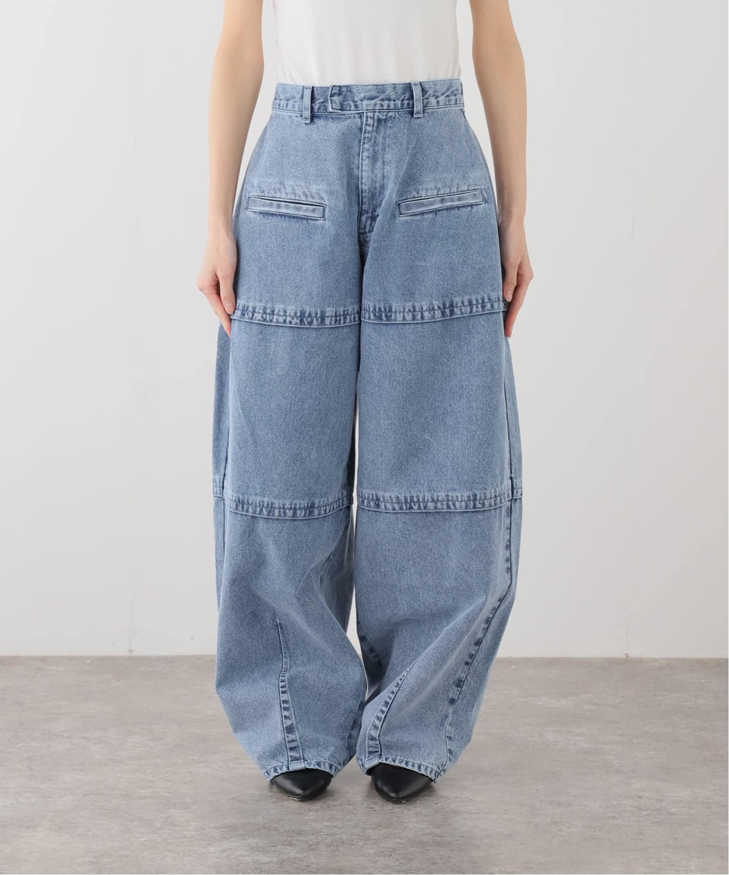 パンツを縦方向に切り替え、カーブをつけて縫製することで、前後に立体的な膨らみを持たせたバギーシルエットを形成しています。