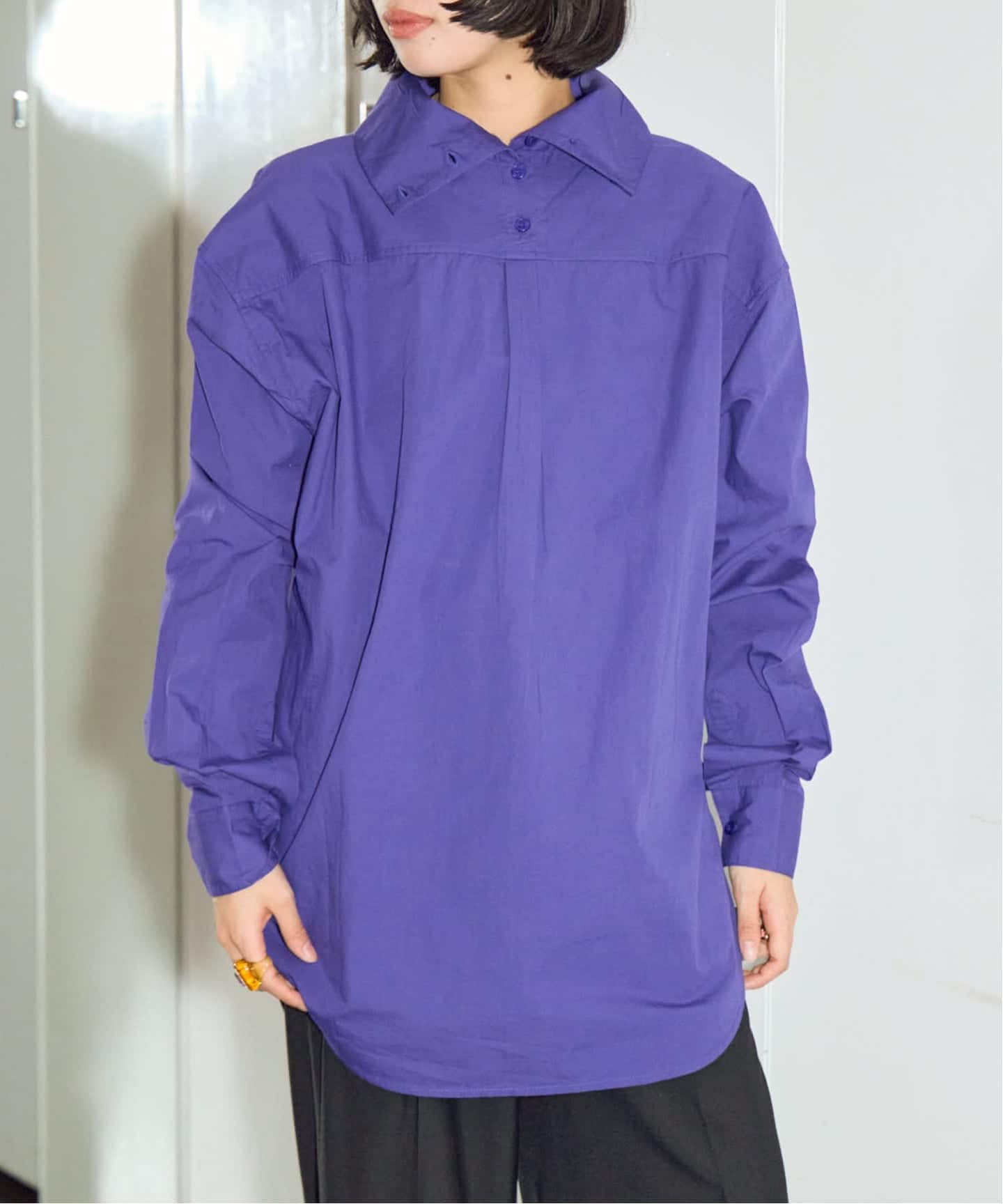 ボタンを留めるとVネック、外すとストレートラインになり着用次第にて印象を変えることが出来ます。