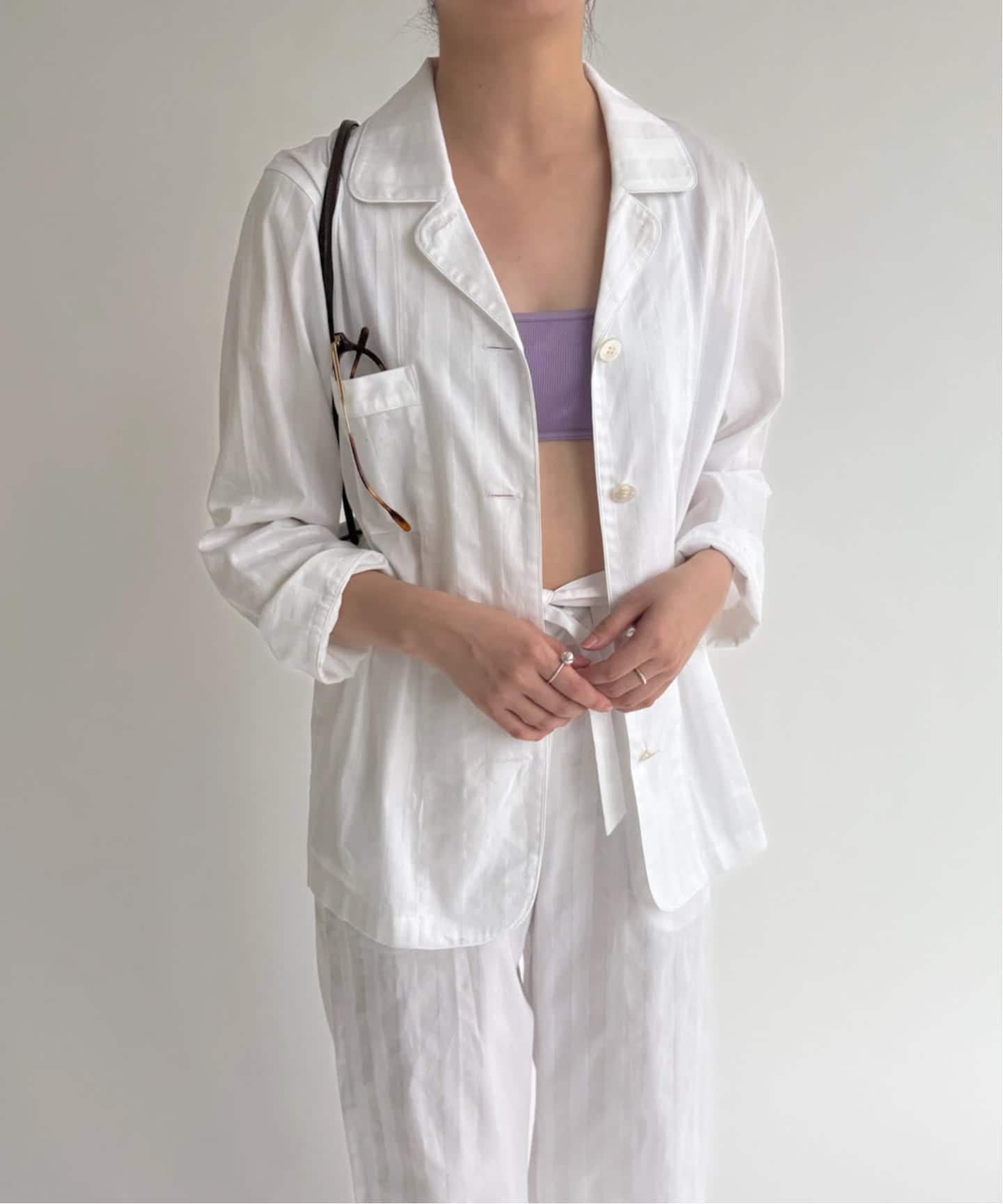 パジャマシャツの襟を少し後ろにぬいて敢えてルーズ感を出した着こなし。