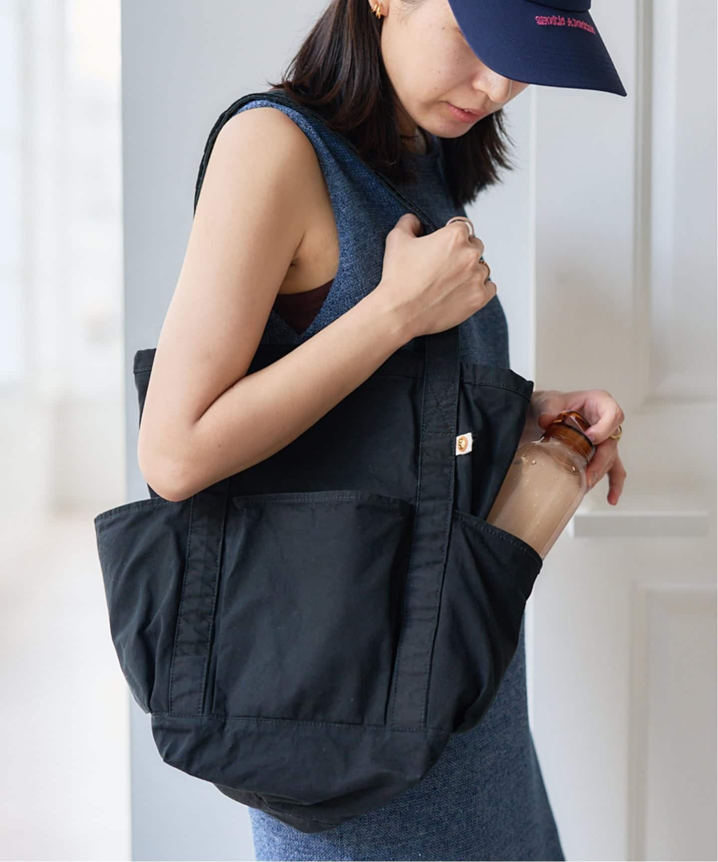 \休日のお出かけに、便利なサイドポケットにはミニボトルや、スマホが入ります/