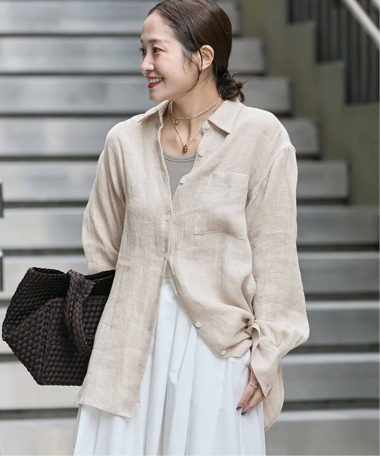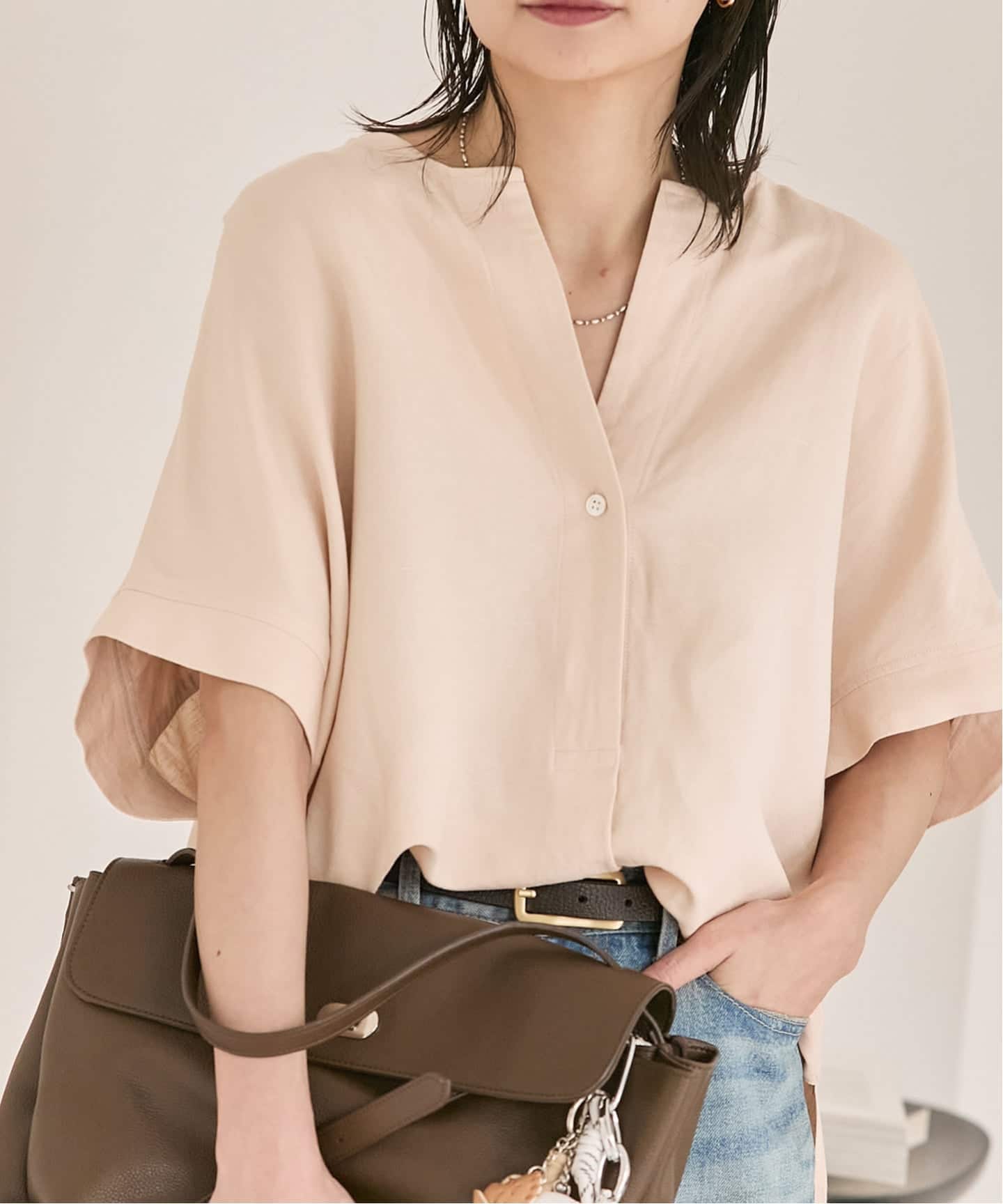 《予約》レーヨン麻ノーカラーブラウス
