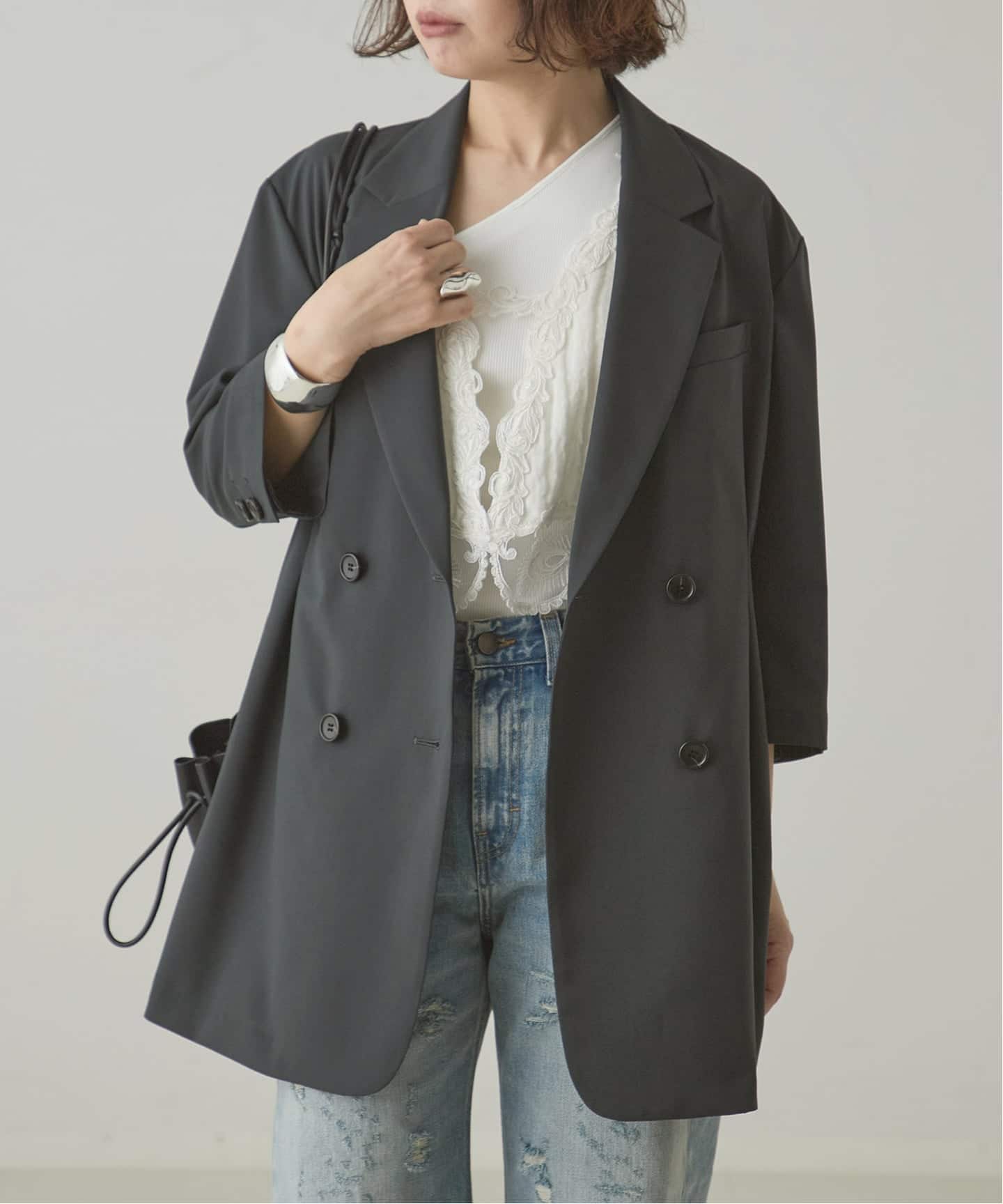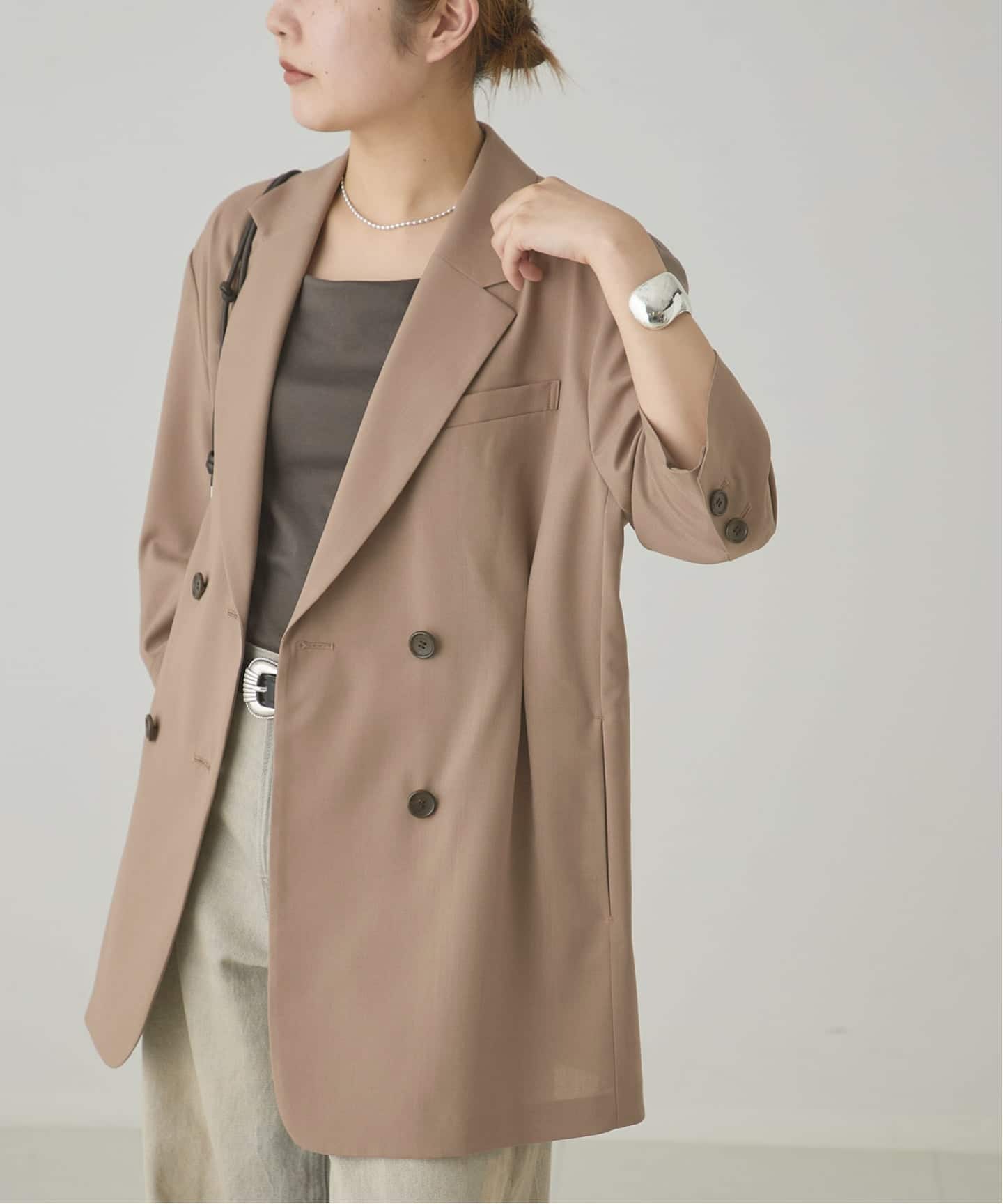 オーバーサイズですがウエストを絞っていることで女性らしいラインを作り出し、縦長シルエットでスタイルアップ効果も期待できそう。
