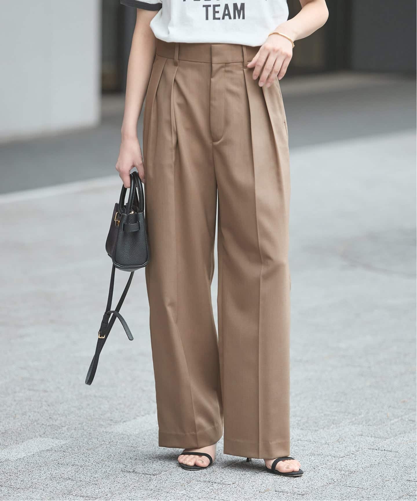 内向きのダブルタックがすっきりとしたシルエットを叶えるワイドパンツ。