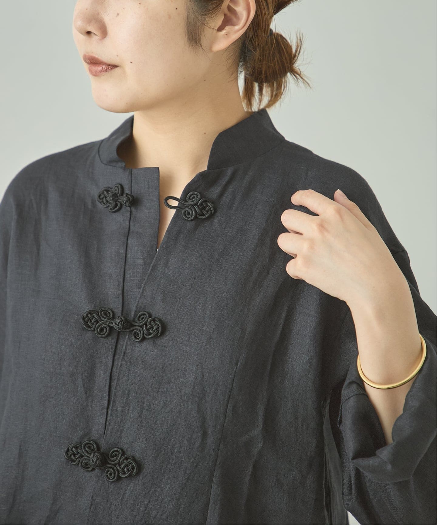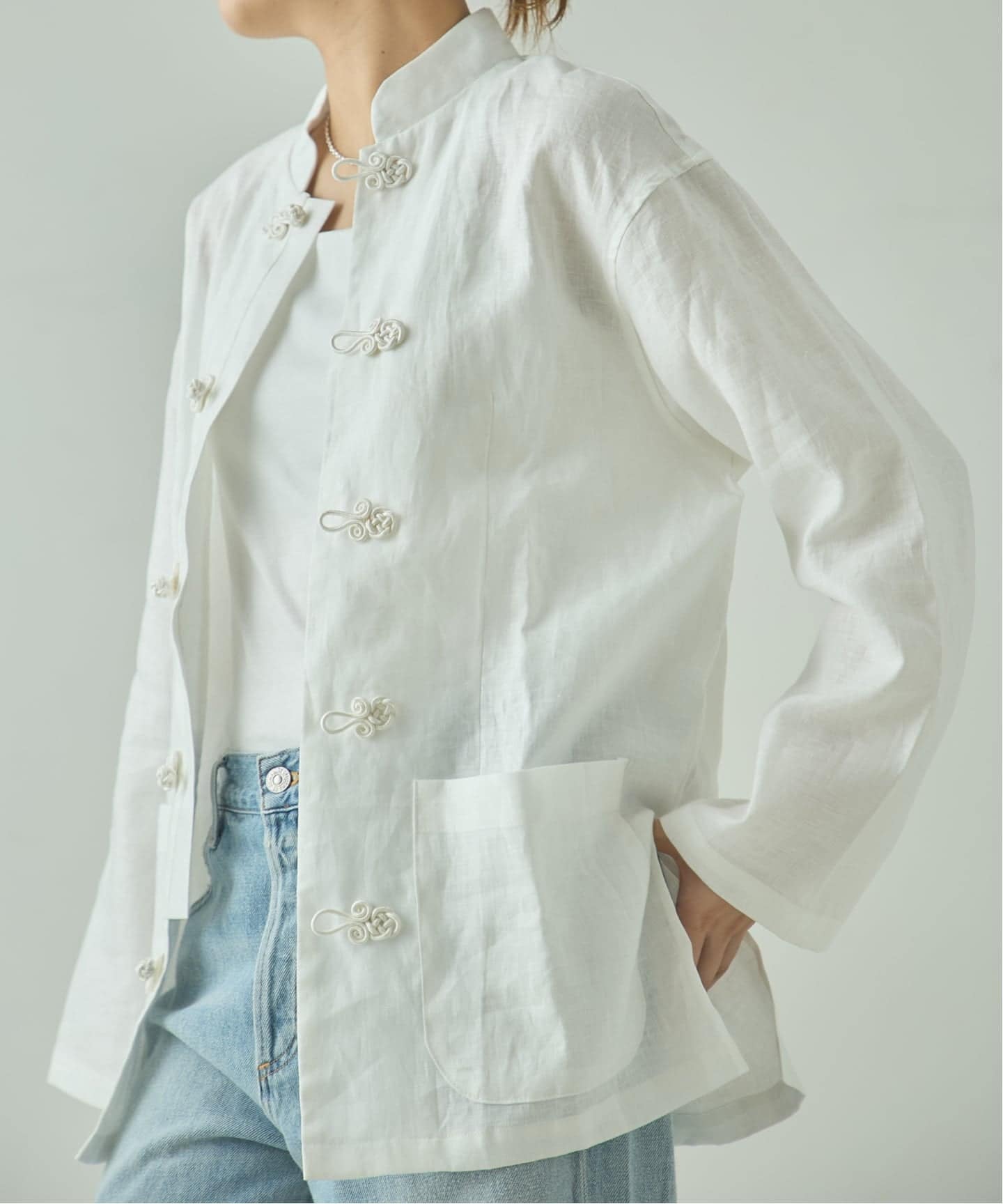 チャイナボタンを留めてシャツとしても、前開きで羽織にしてもおすすめ。