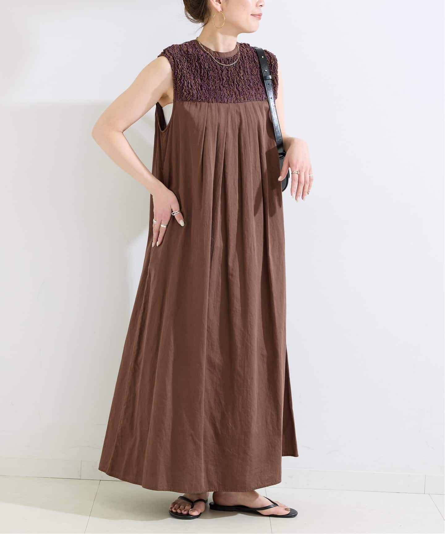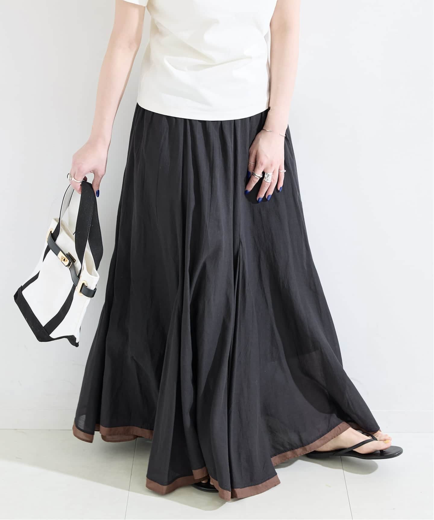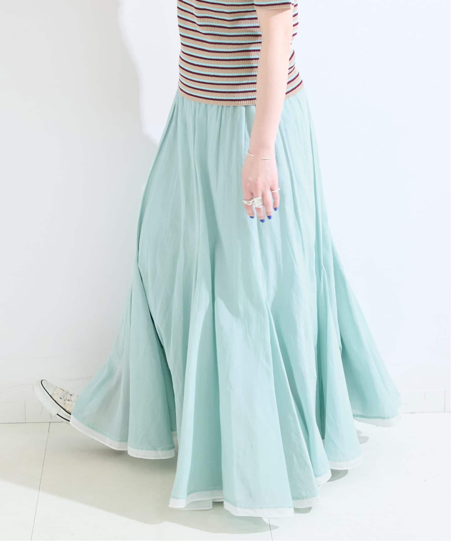 ハリ感のある素材なのでボリュームが出やすく、ウエスト切替のギャザーを寄せたふんわりとしたシルエットが魅力。