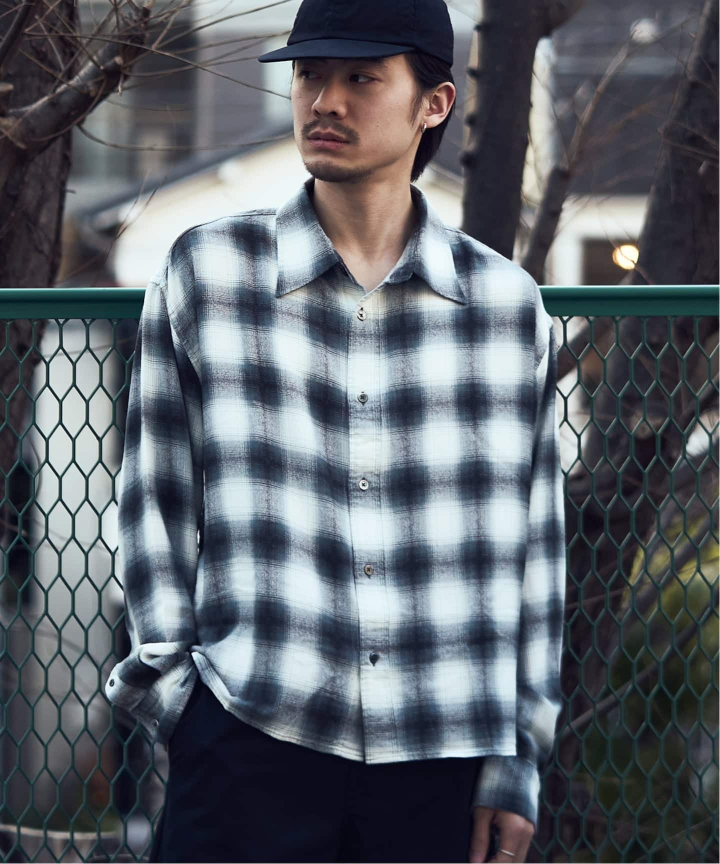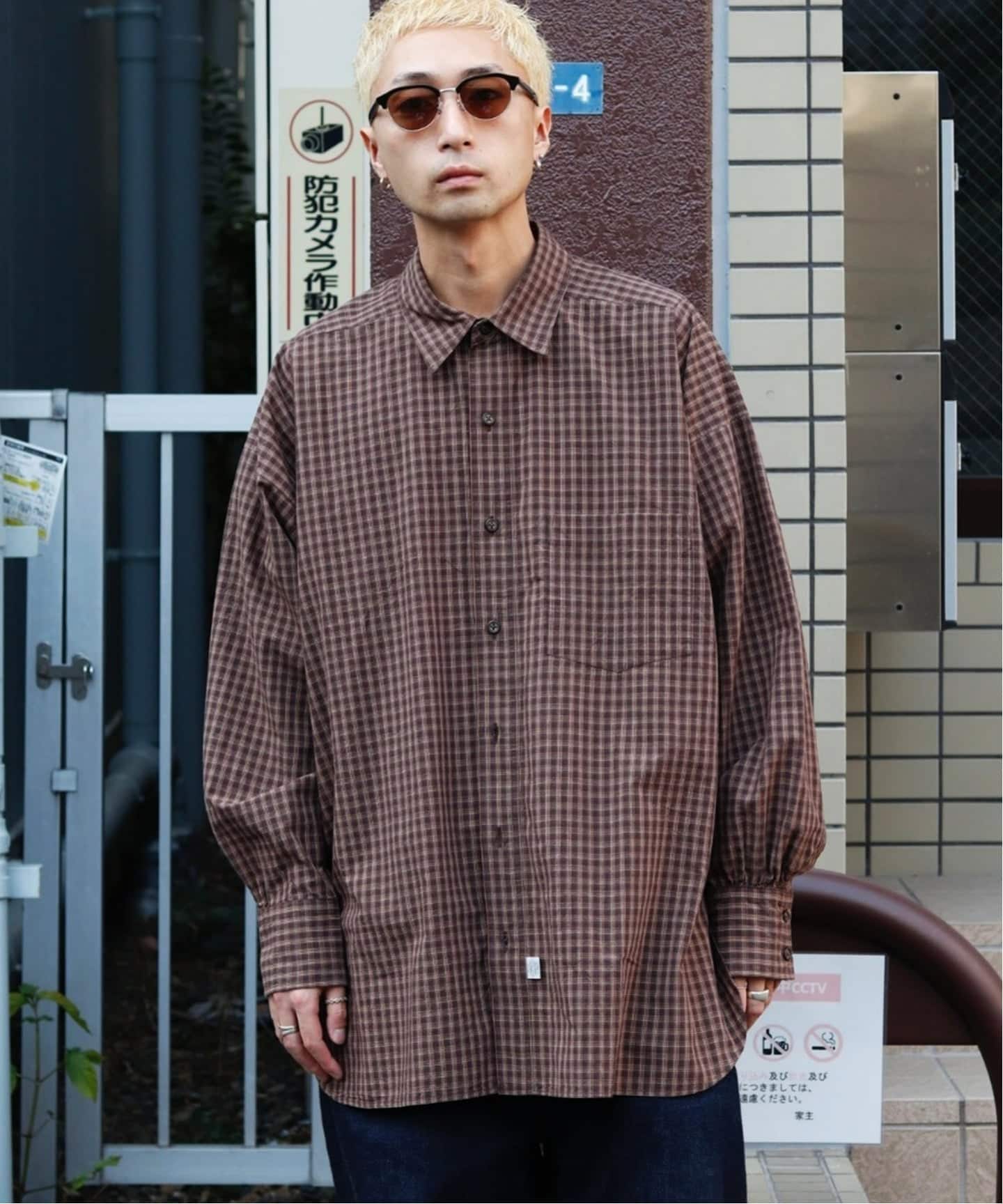 着用しているのはタータンチェック、navyがオンブレチェック、それぞれ異なるパターンの柄を用いたのロングスリーブシャツです。