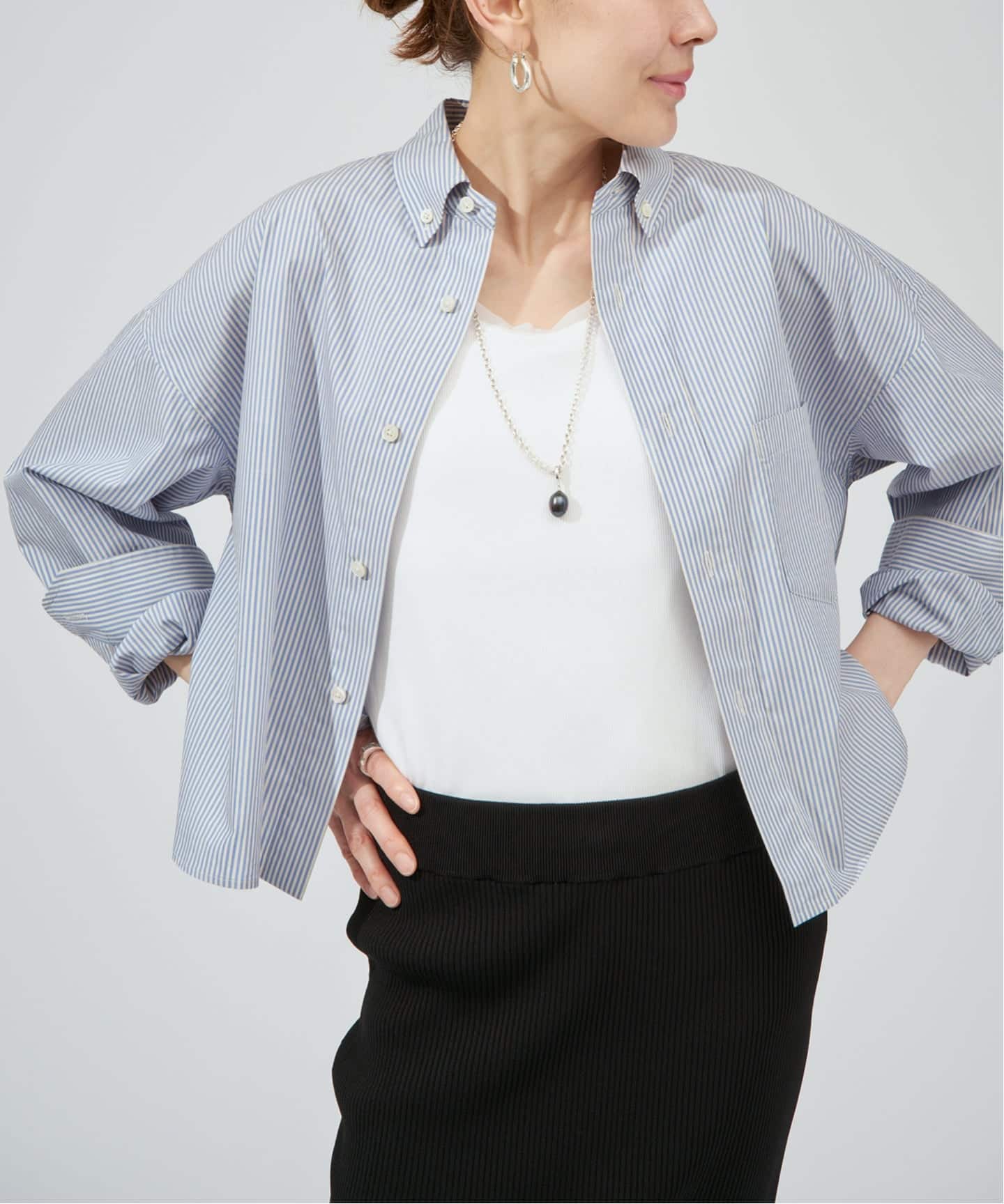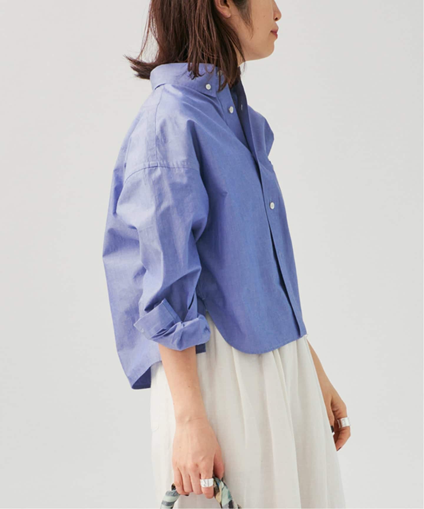 「きちんと感と軽やかさを両立する、洗練ブルーシャツ。」