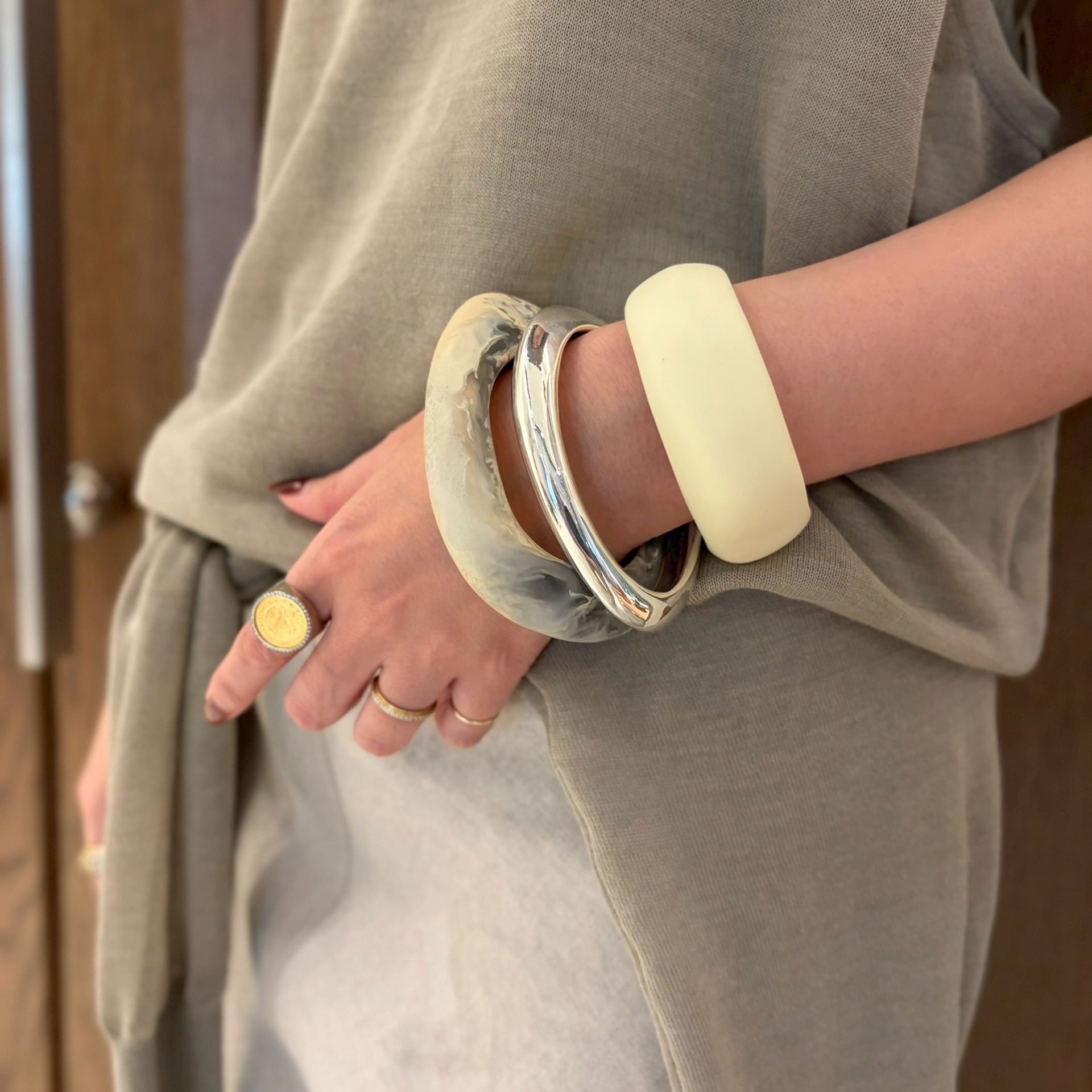 大ぶりなバングルも今年の気分。腕の出る季節ならではの楽しみですよね。