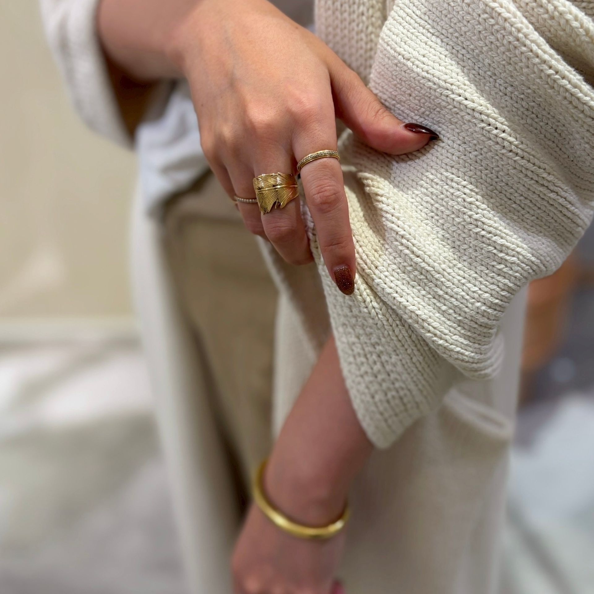 ニットの袖をたくし上げる仕草すらも素敵に見せてくれるのが手元のジュエリー。