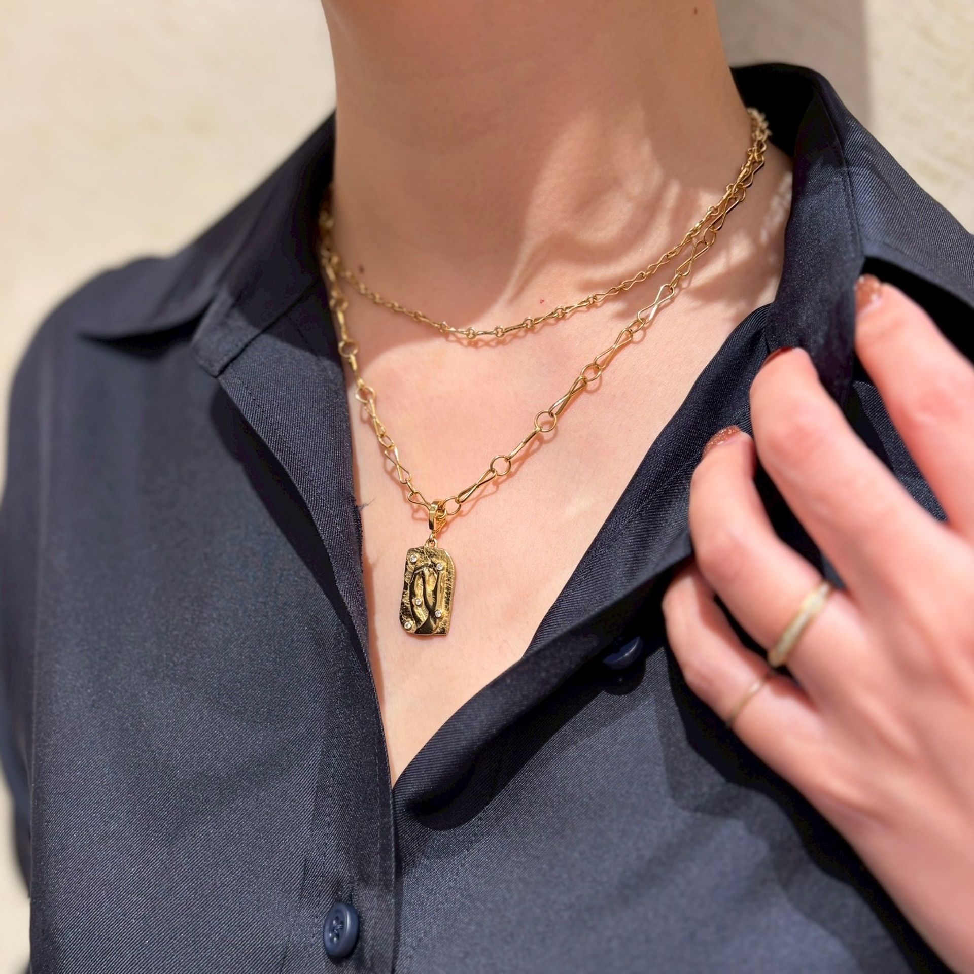 AZLEEのMOTIFチェーンはインパクトの中にもやさしい表情があり、フェミニンで凛とした女性に良く似合います。