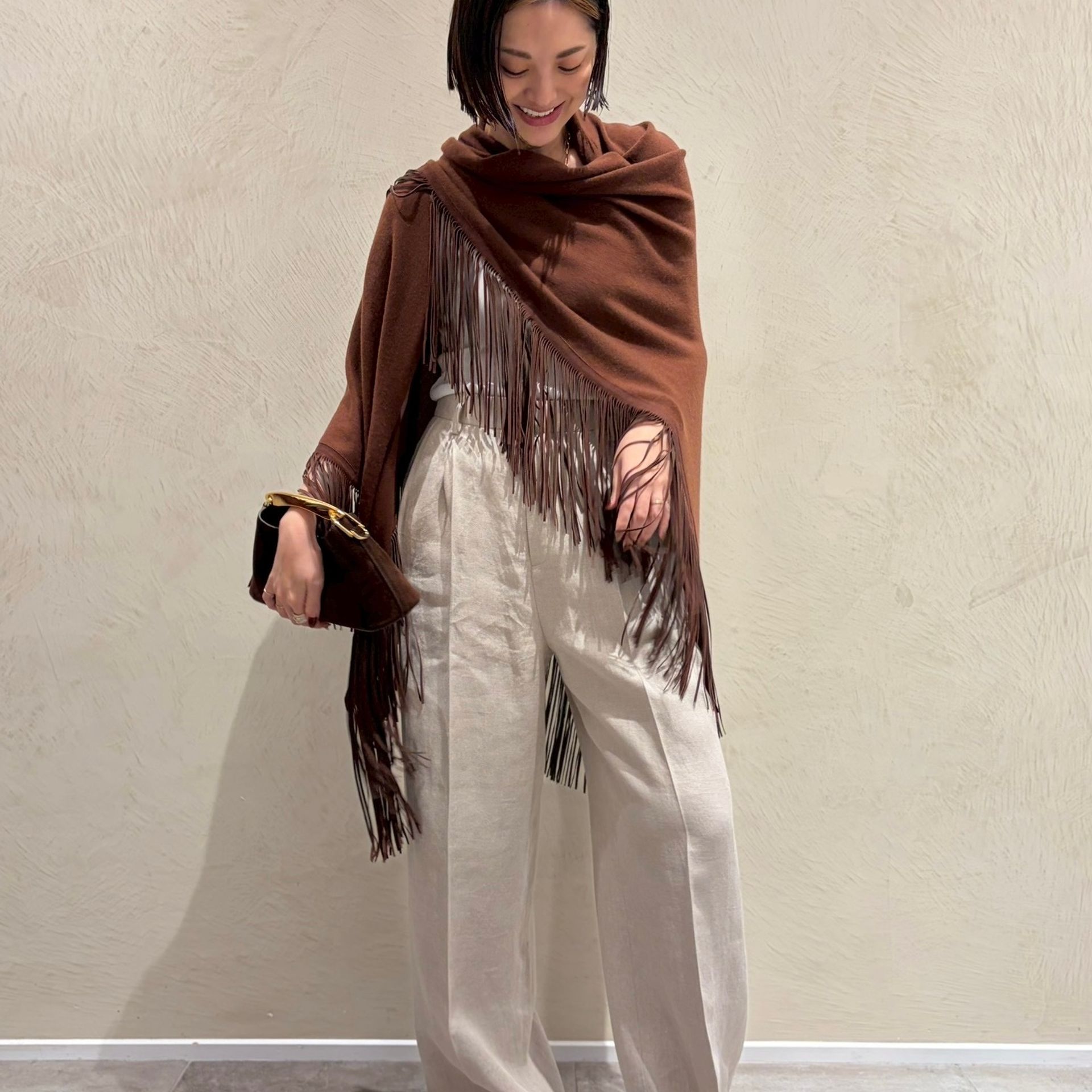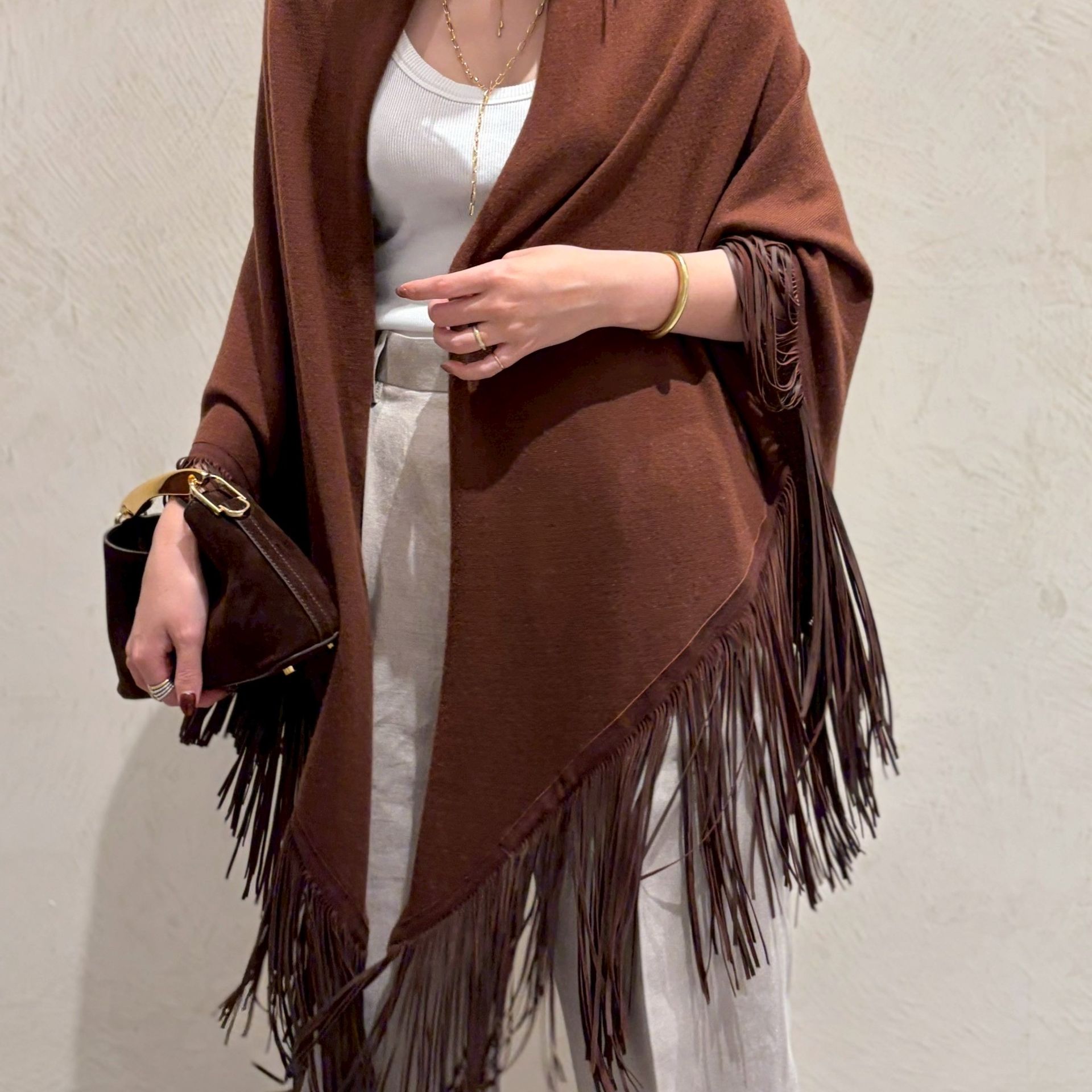 ELY ELYのフリンジストール、チョコレートみたいな色がやっぱり可愛いなあ、何と合わせたらいいかなあと巻きながら店内をうろうろ。
