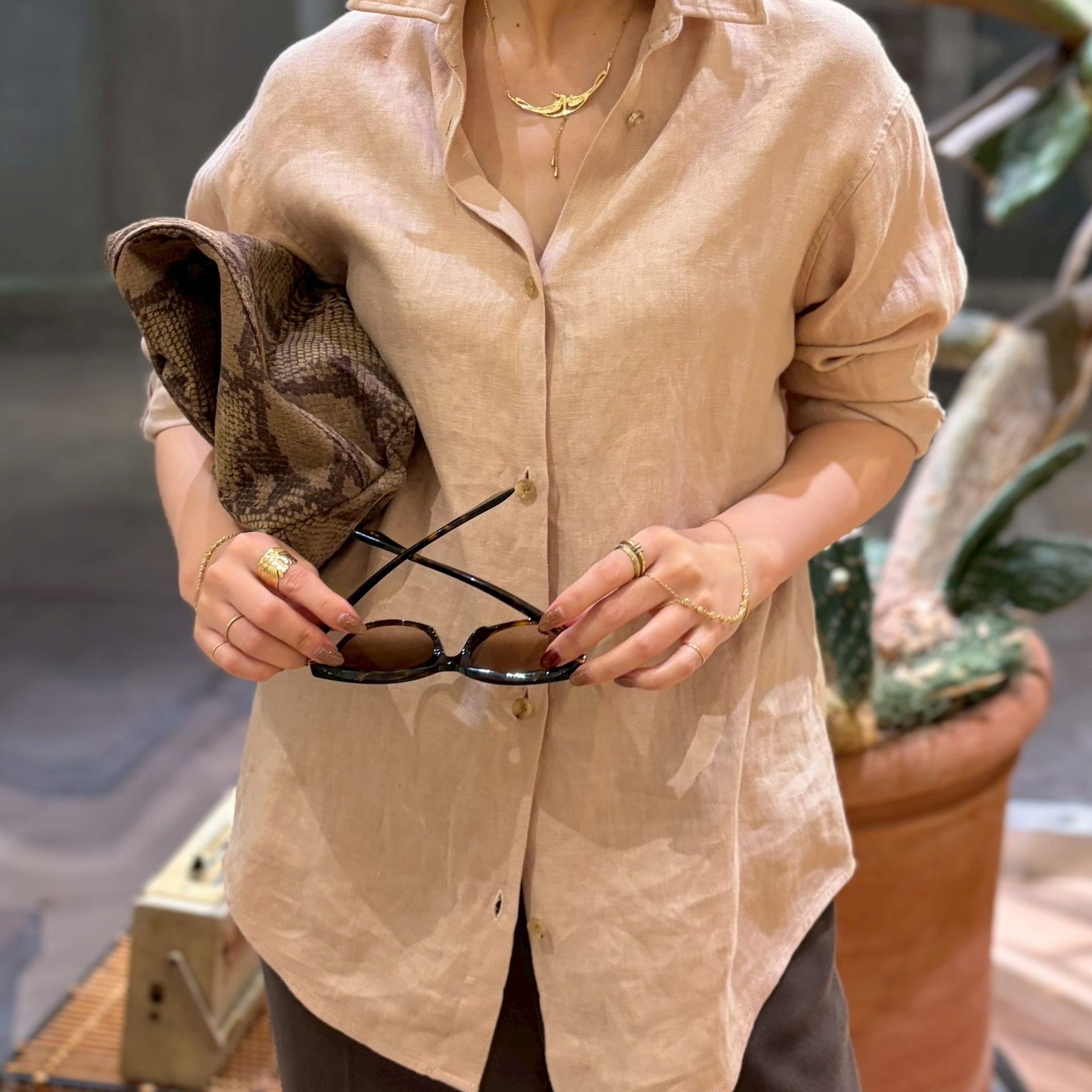 定番のシャツは、リラクシーな雰囲気でもワイヤー入りの襟で顔周りはしっかり美しく。