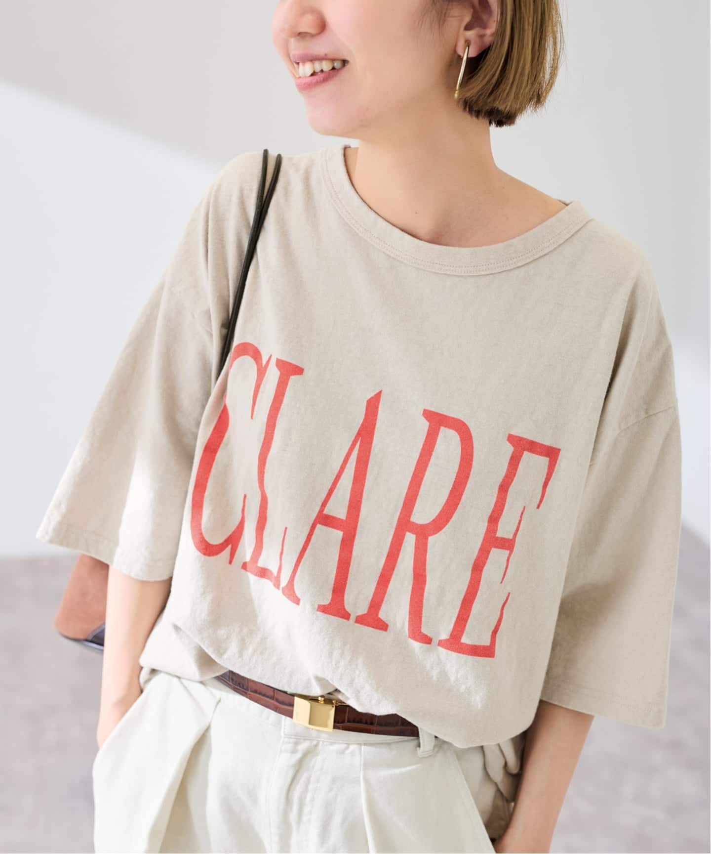 ボートネックで、後ろ丈がやや長めのラウンドヘムのデザインがシンプルながらも決まるアイテムに。