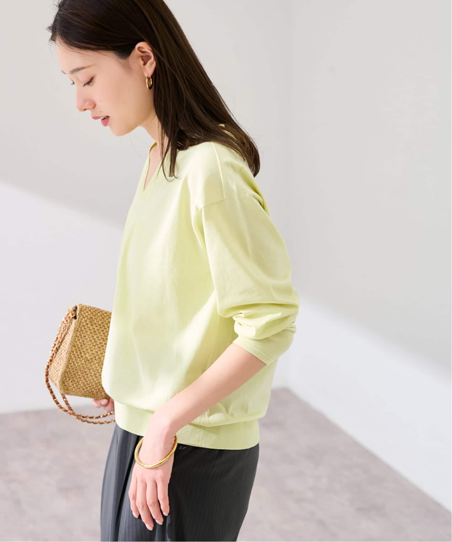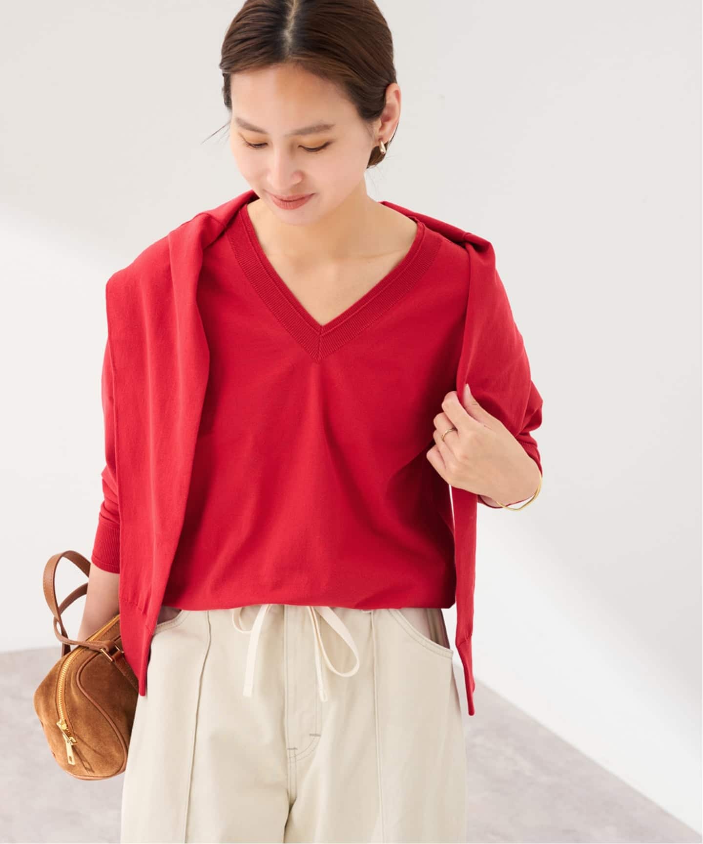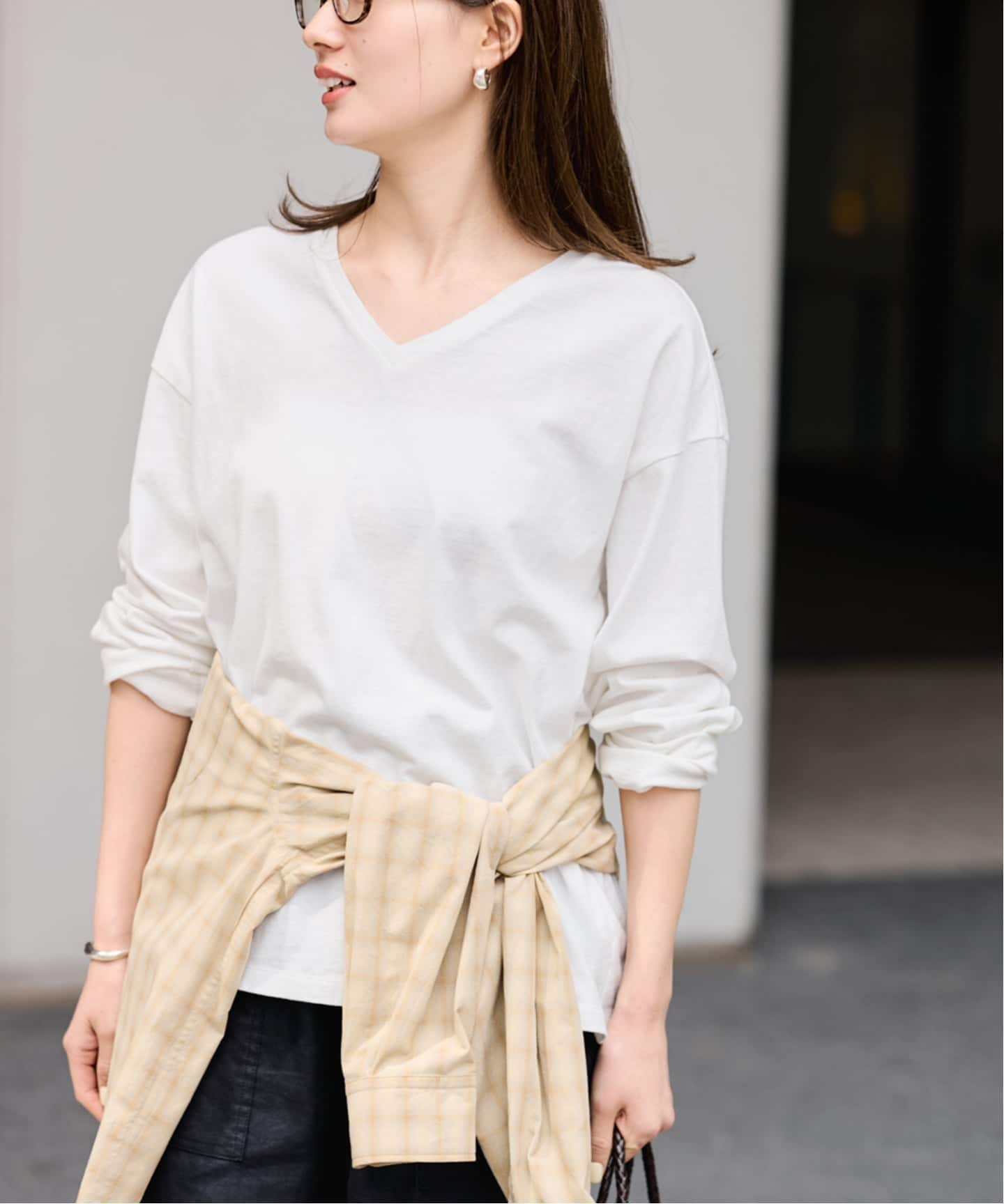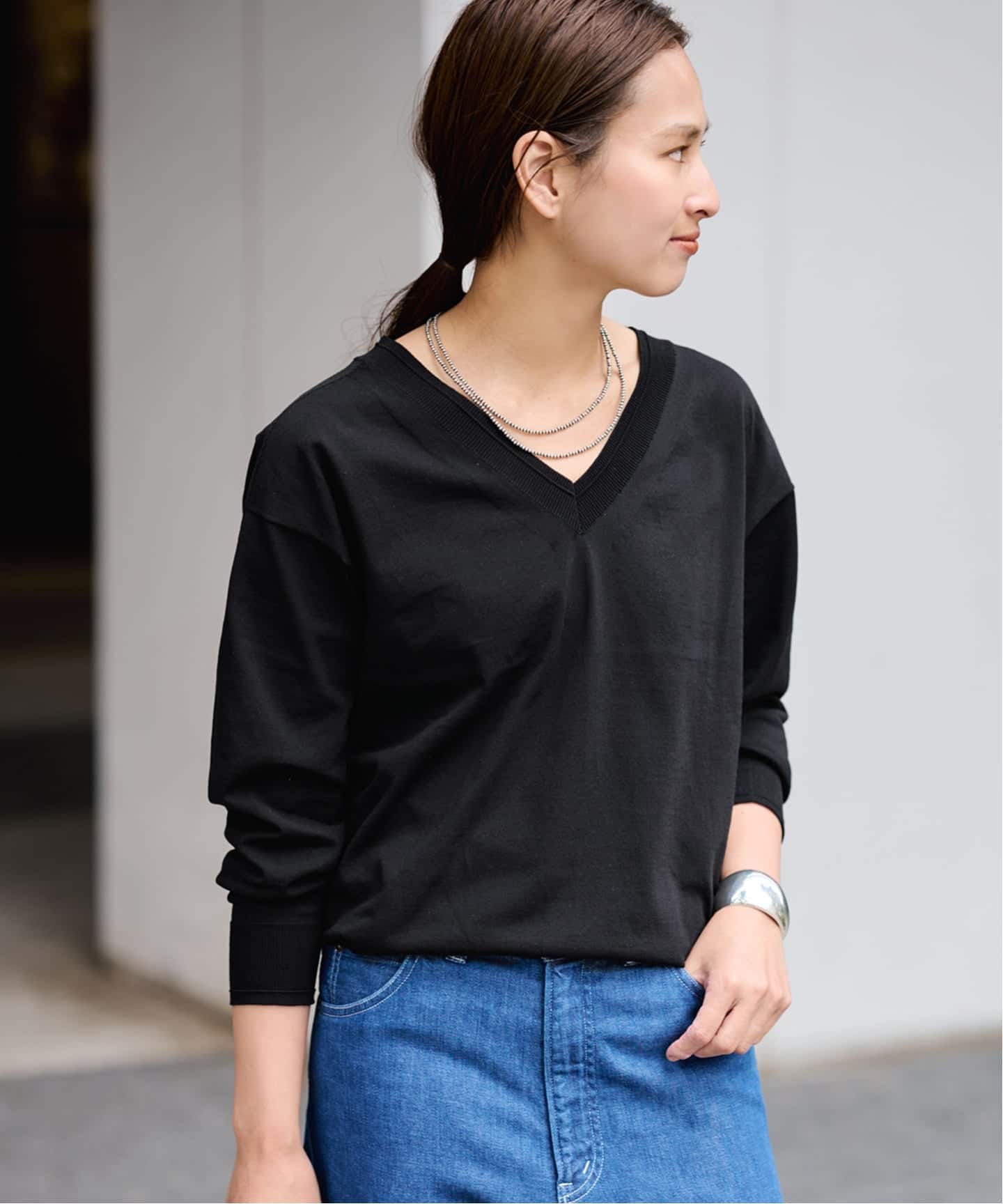 衿ぐりを大きめに開けた緩やかなVラインで、抜け感のある女性らしいシルエットに。
