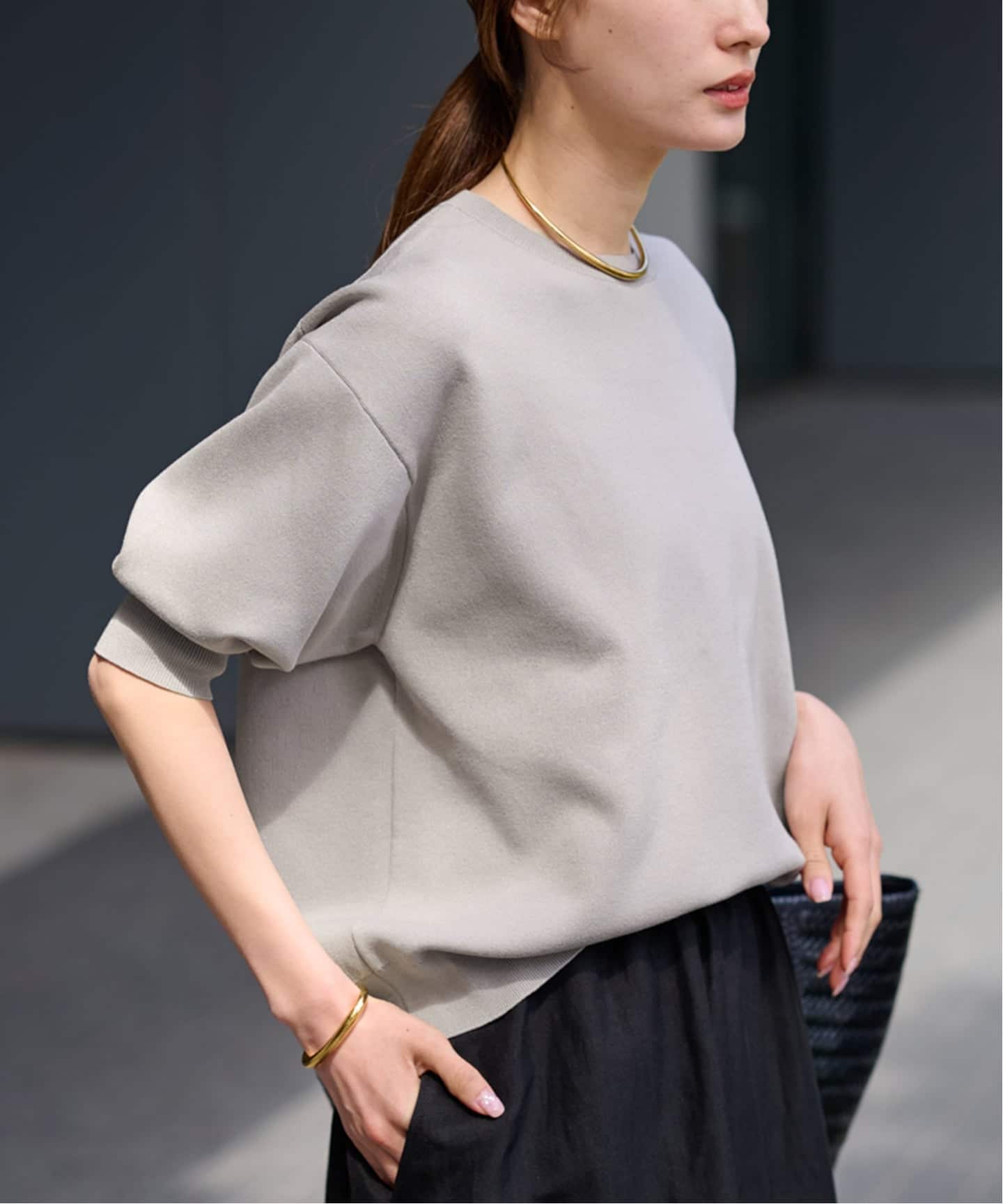 ややハリ感のある生地にすることで、袖のシルエットが出てくれて綺麗見えに。