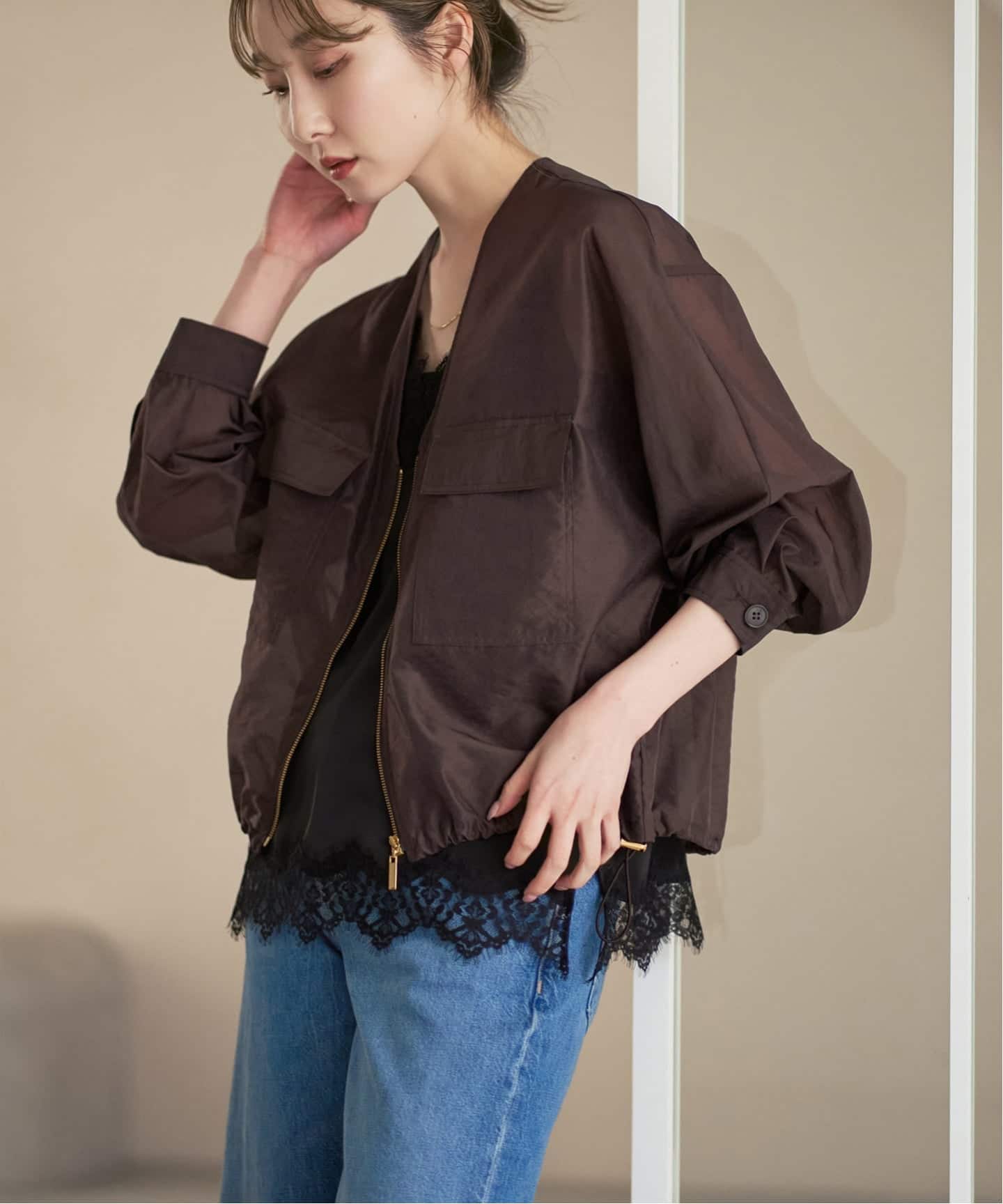 絶妙グリーンのドレープブラウスに柔らかなベージュが印象的なデニムパンツで、大人のカジュアルルックを完成させて。