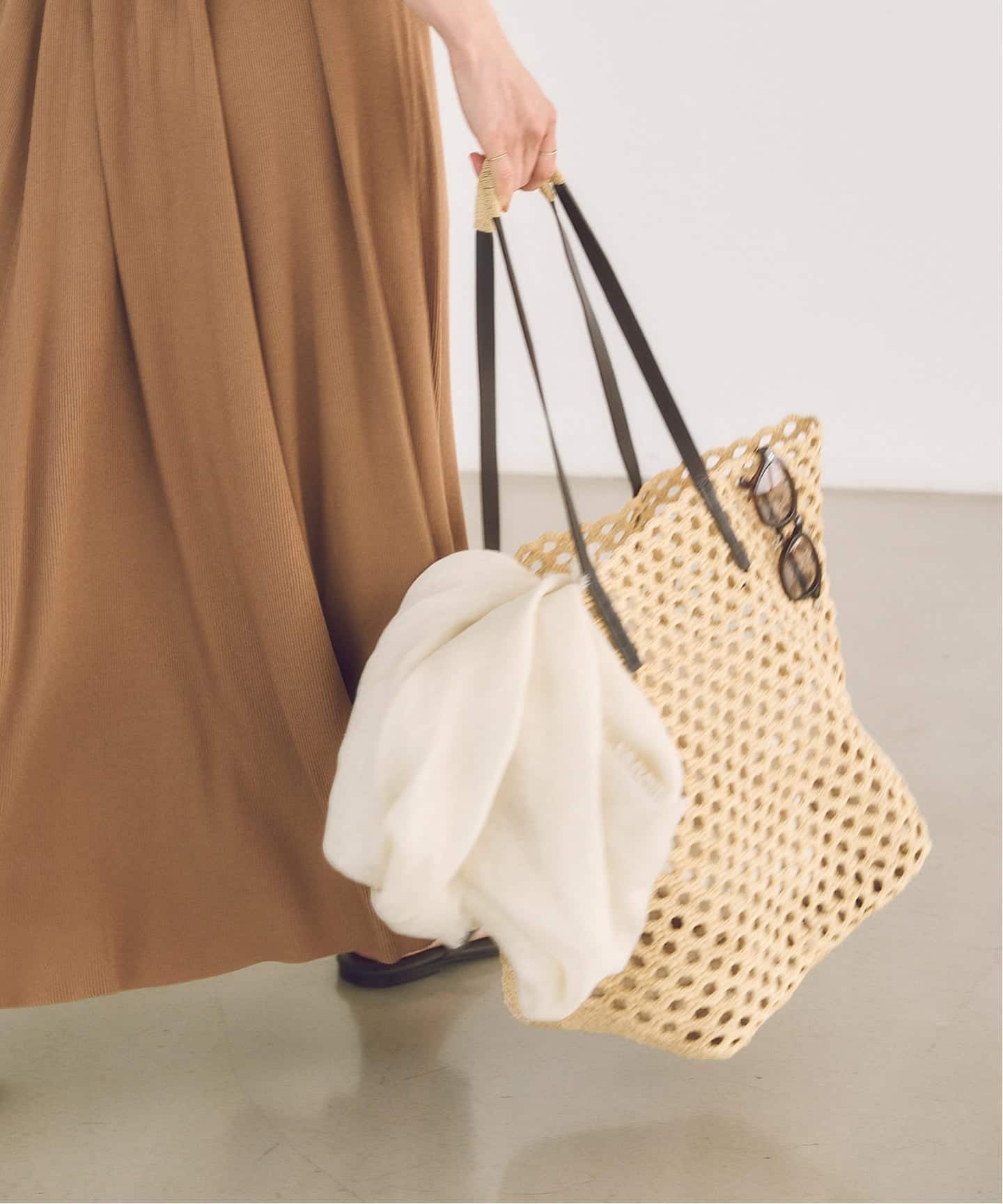 ポイントとして効いたサングラスやナチュラルなカゴバッグなど、リゾートなムードを高める夏小物をぎゅっと詰め込んで。