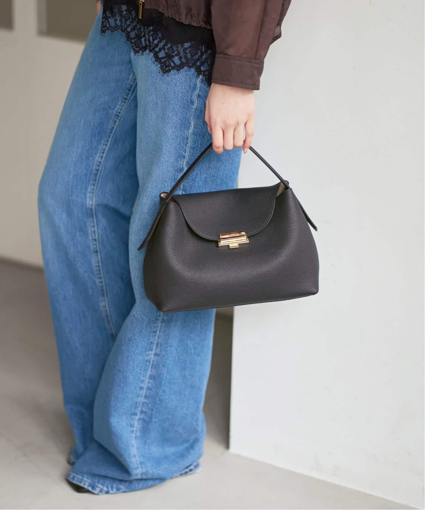 濃色のベルトやバッグで全体の印象を引き締めれば、お洒落指数もググっとUPします。