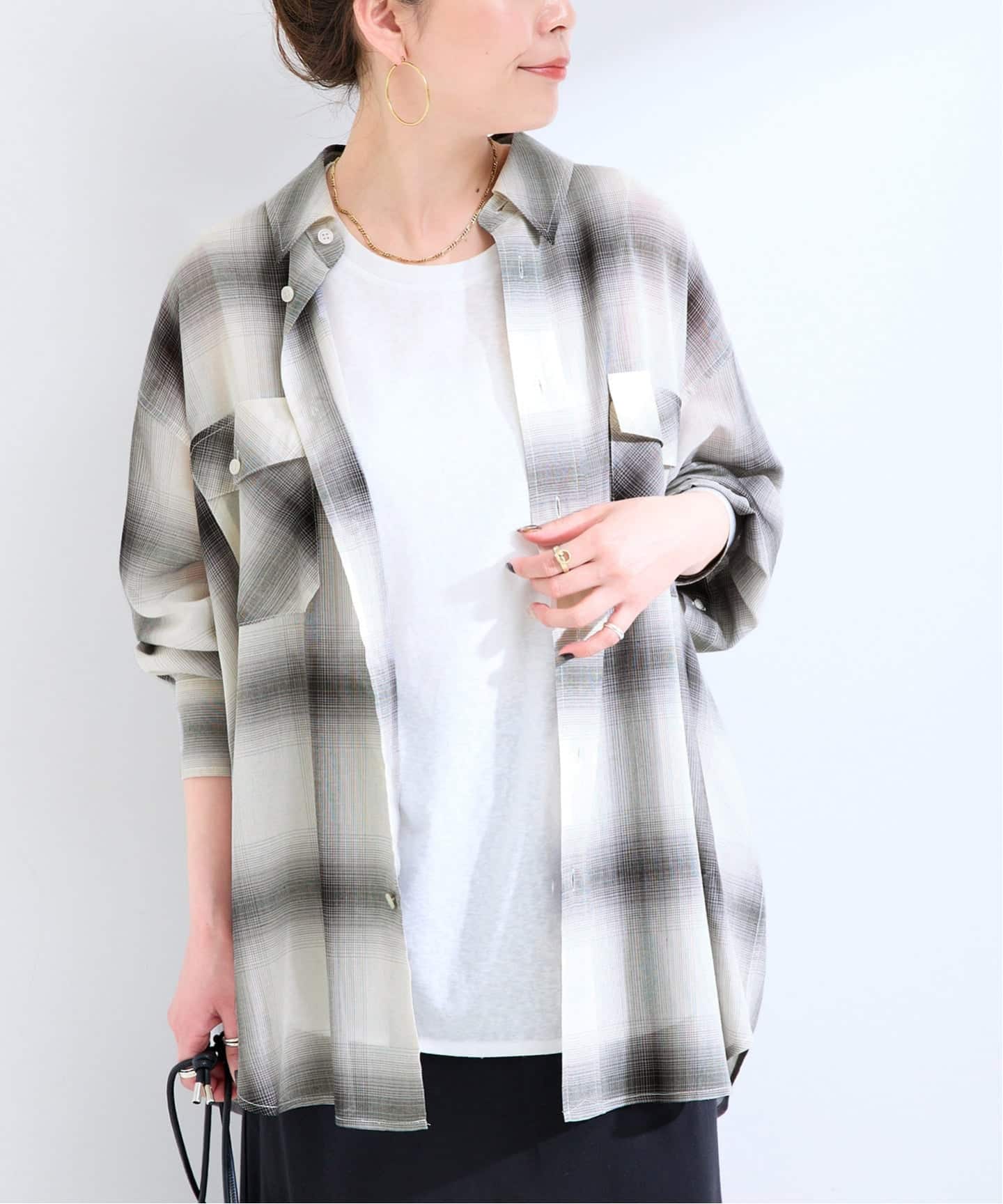 儚い色差のニュートラルな配色のオンブレチェック柄ですが、生地感も相まって大人っぽいルーズなフィット感でイン/アウト両軸で着用いただけます。程よいシアー素材でぐっと軽やかなスタイリングに。