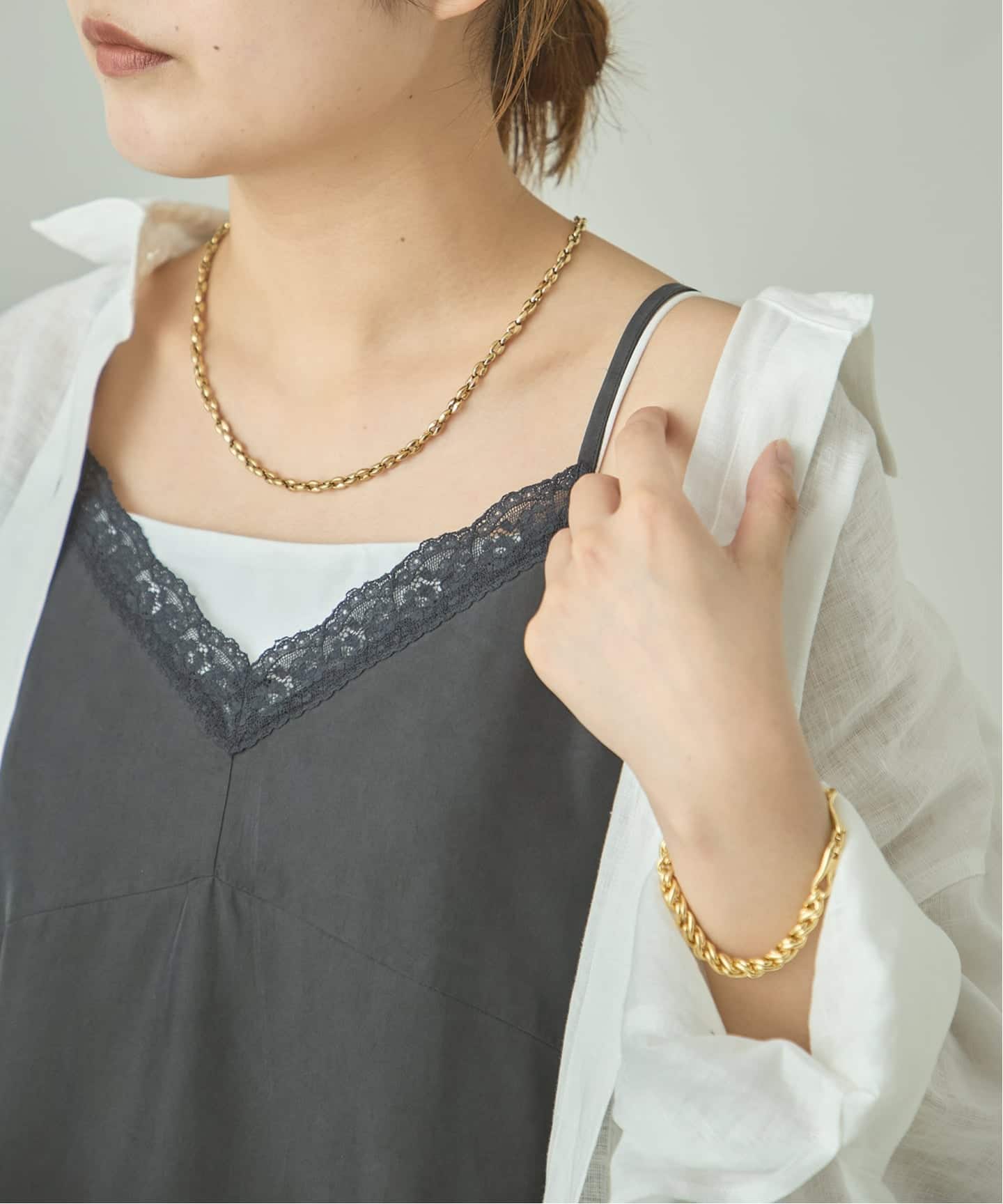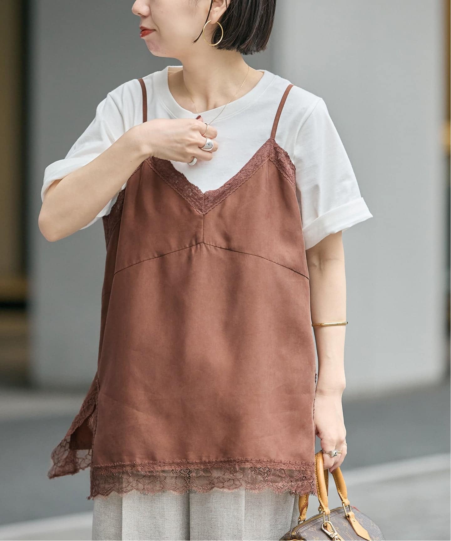 レイヤードスタイルにぴったりなキャミソール型は長いシーズン着回しできる優れもの◎