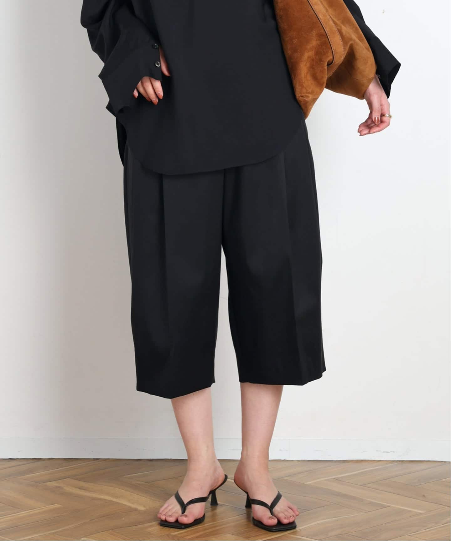 膝下のワイドシルエットのパンツには、ヒールサンダルを合わせるのが気分。