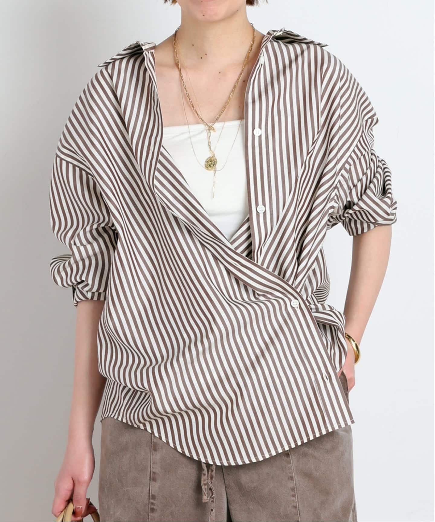 オーバーシルエットのブラウスは、ショートパンツでモダンにこなしたい。