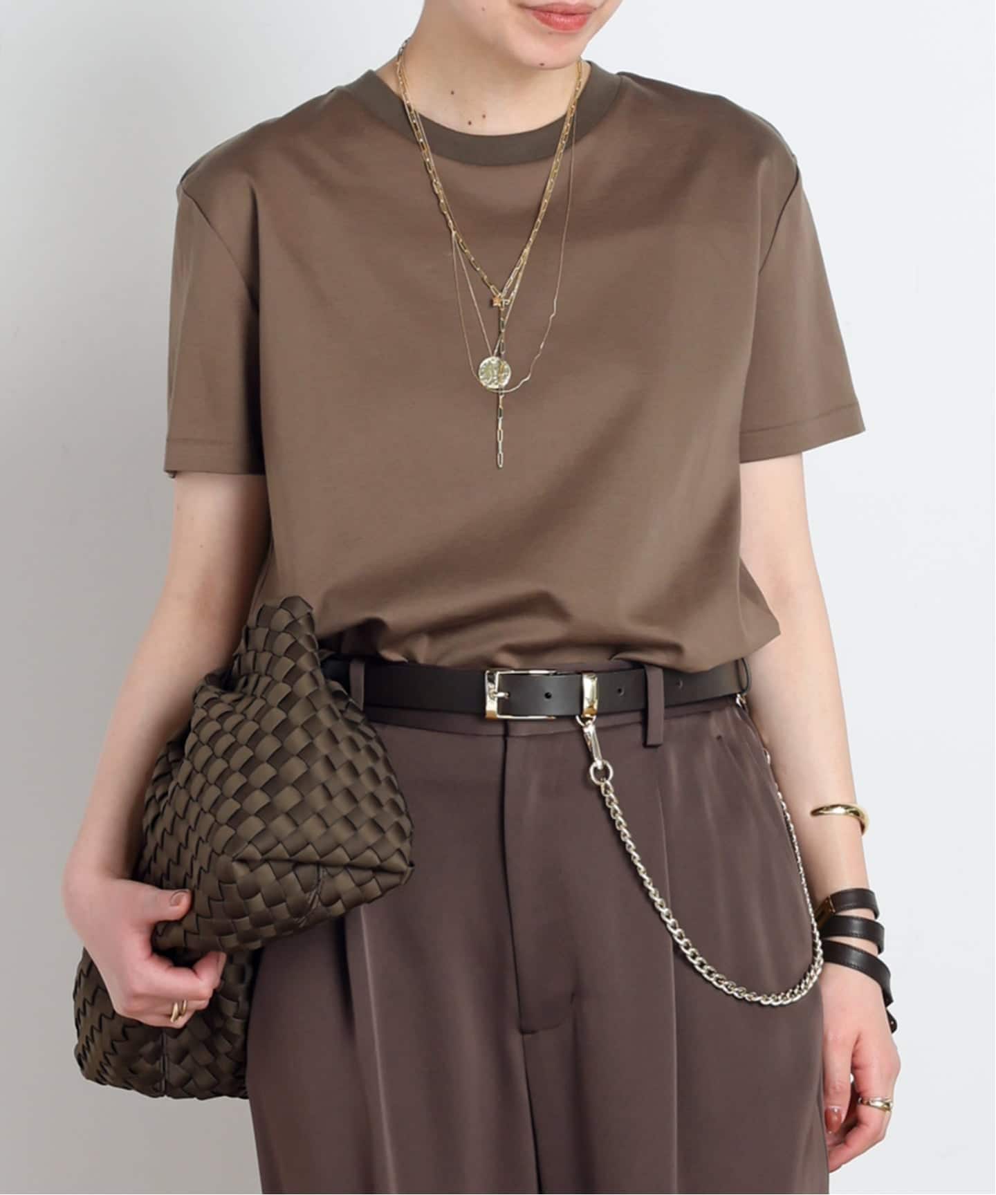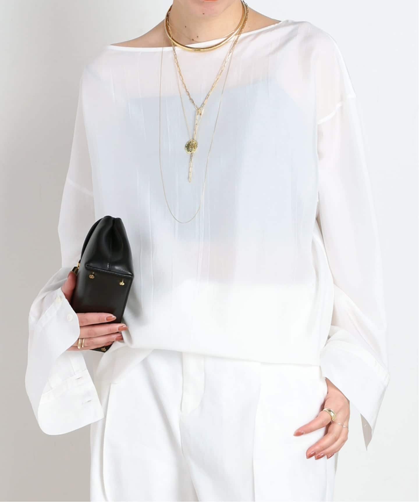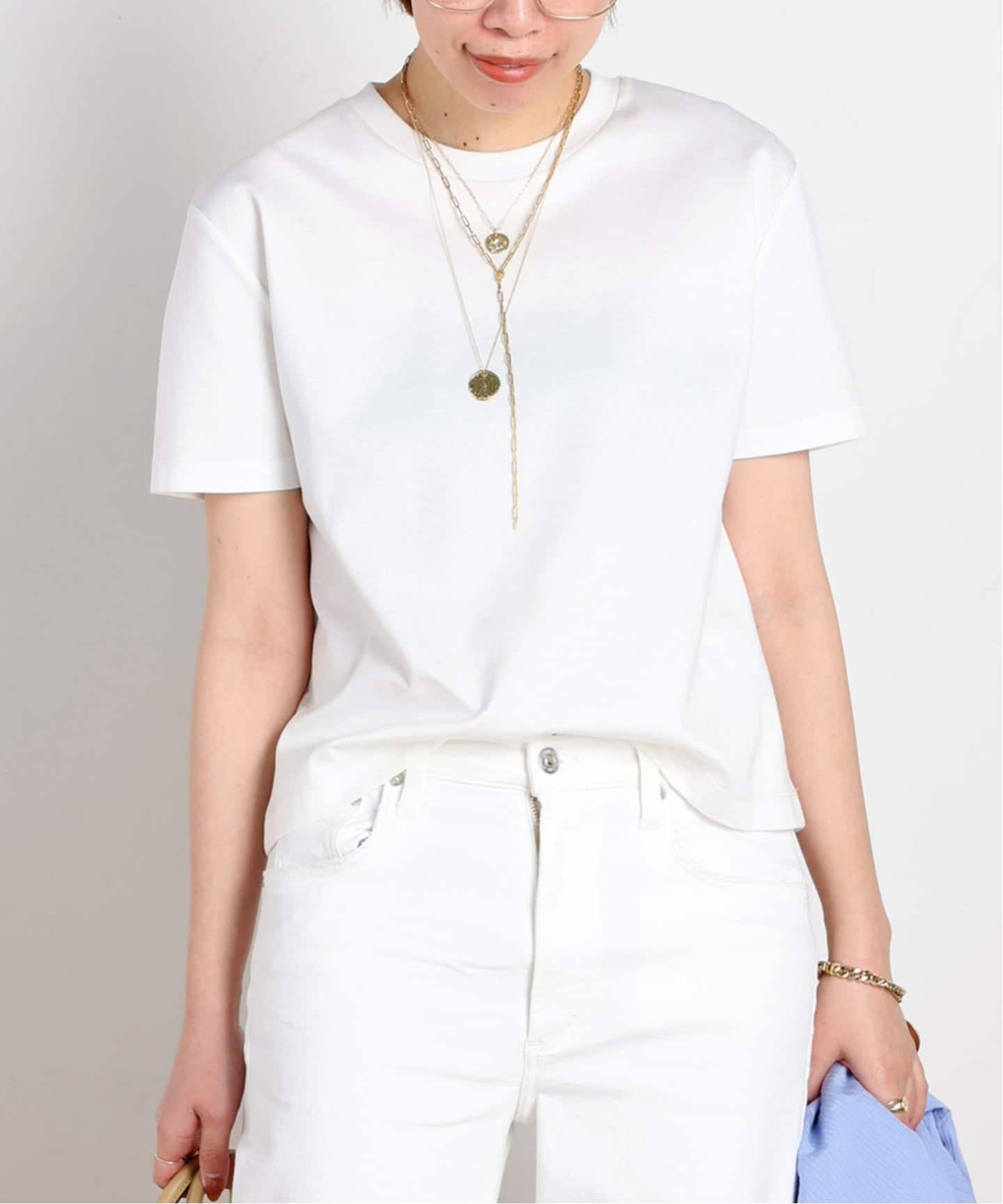 初夏を感じるトップスには、素材で統一感を。