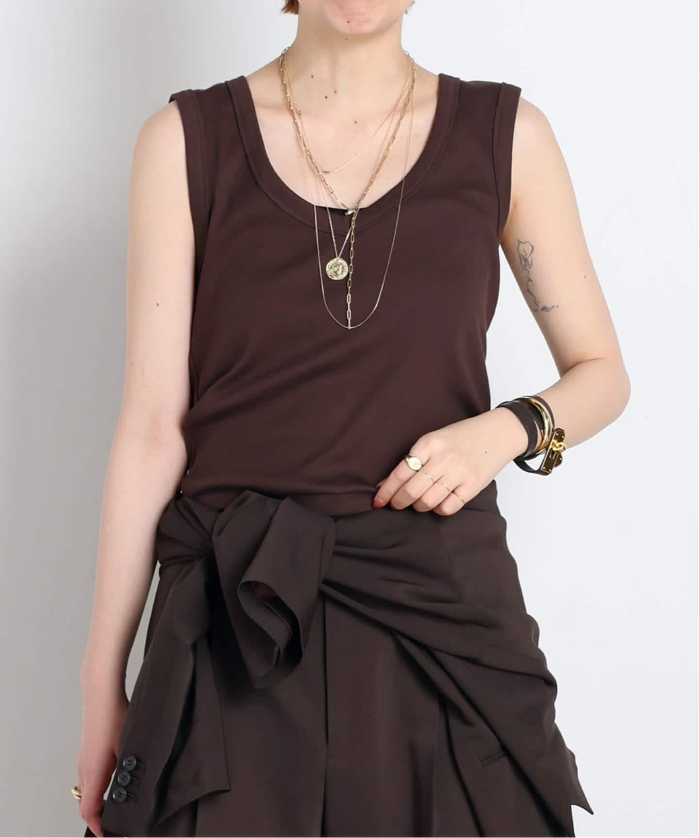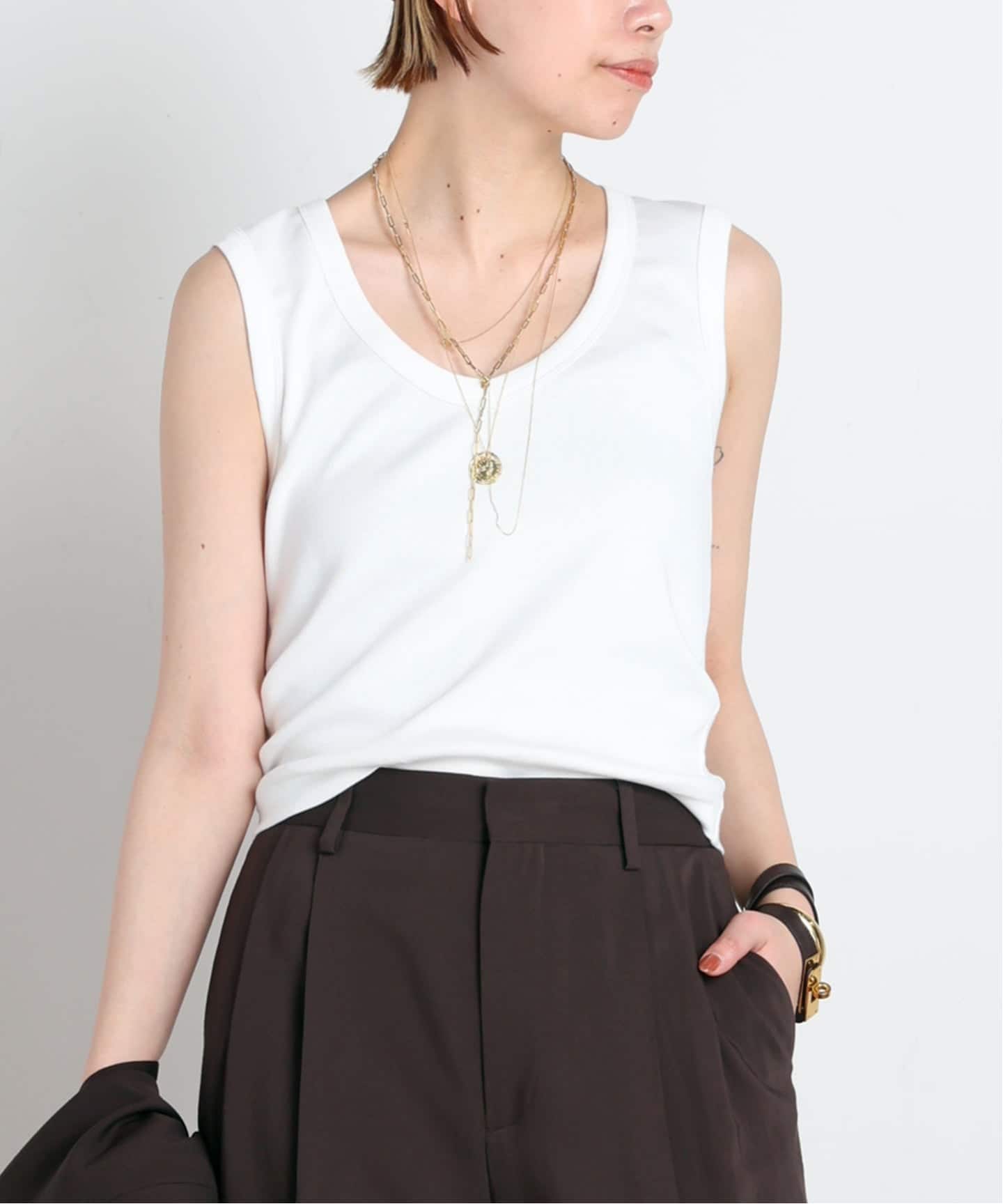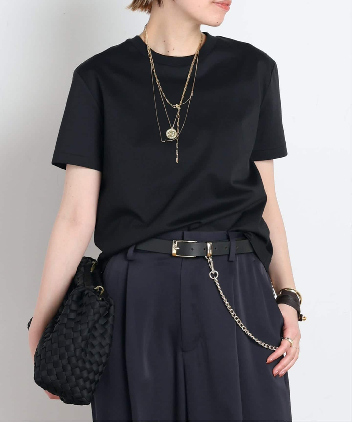 初夏を感じるトップスには、素材で統一感を。