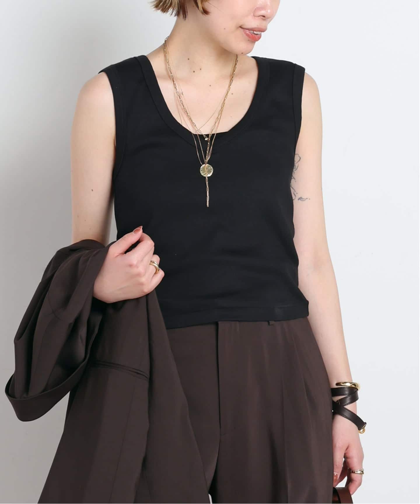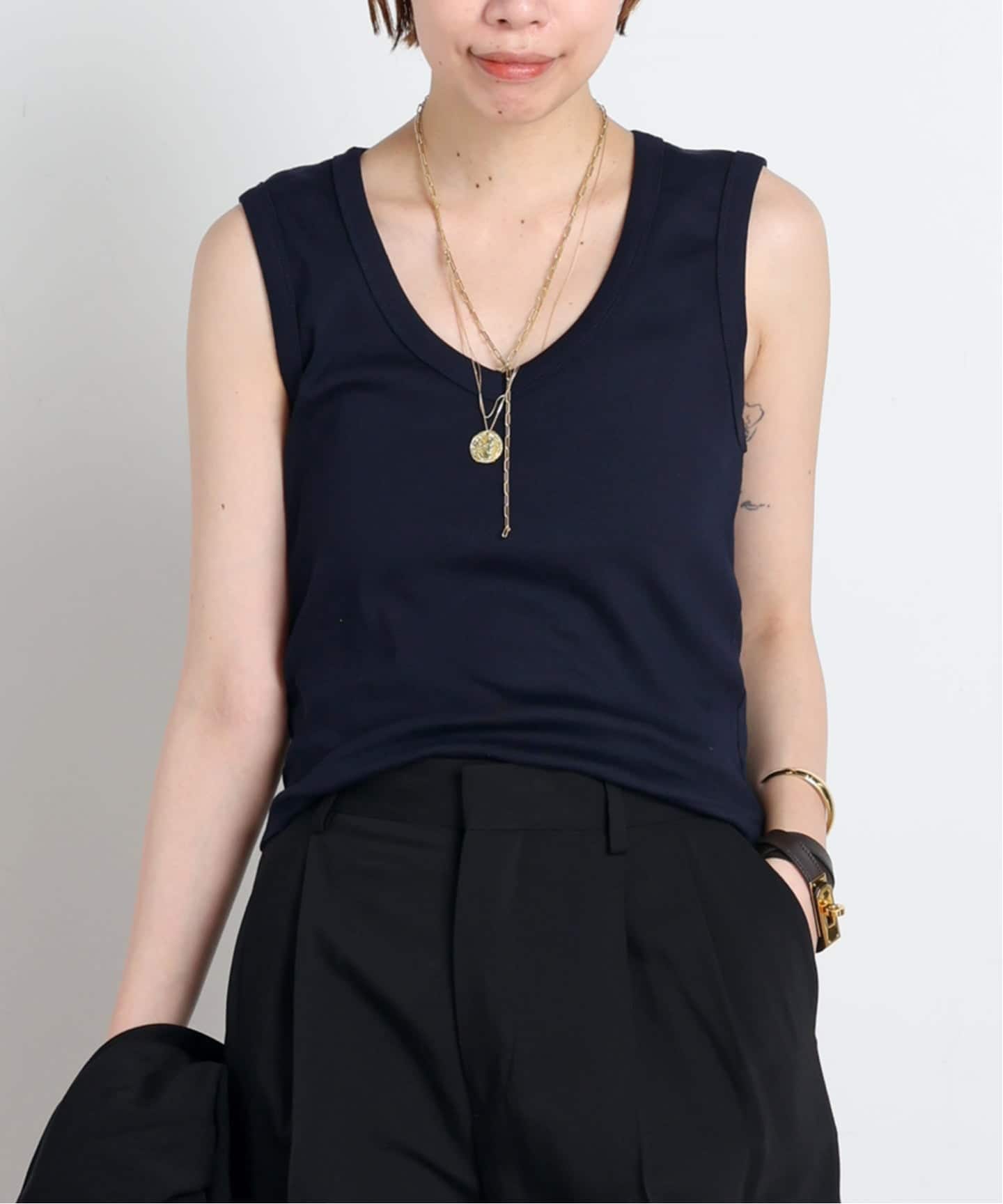 ジャケットのインナーに、今シーズンはVネックのトップスが気分。