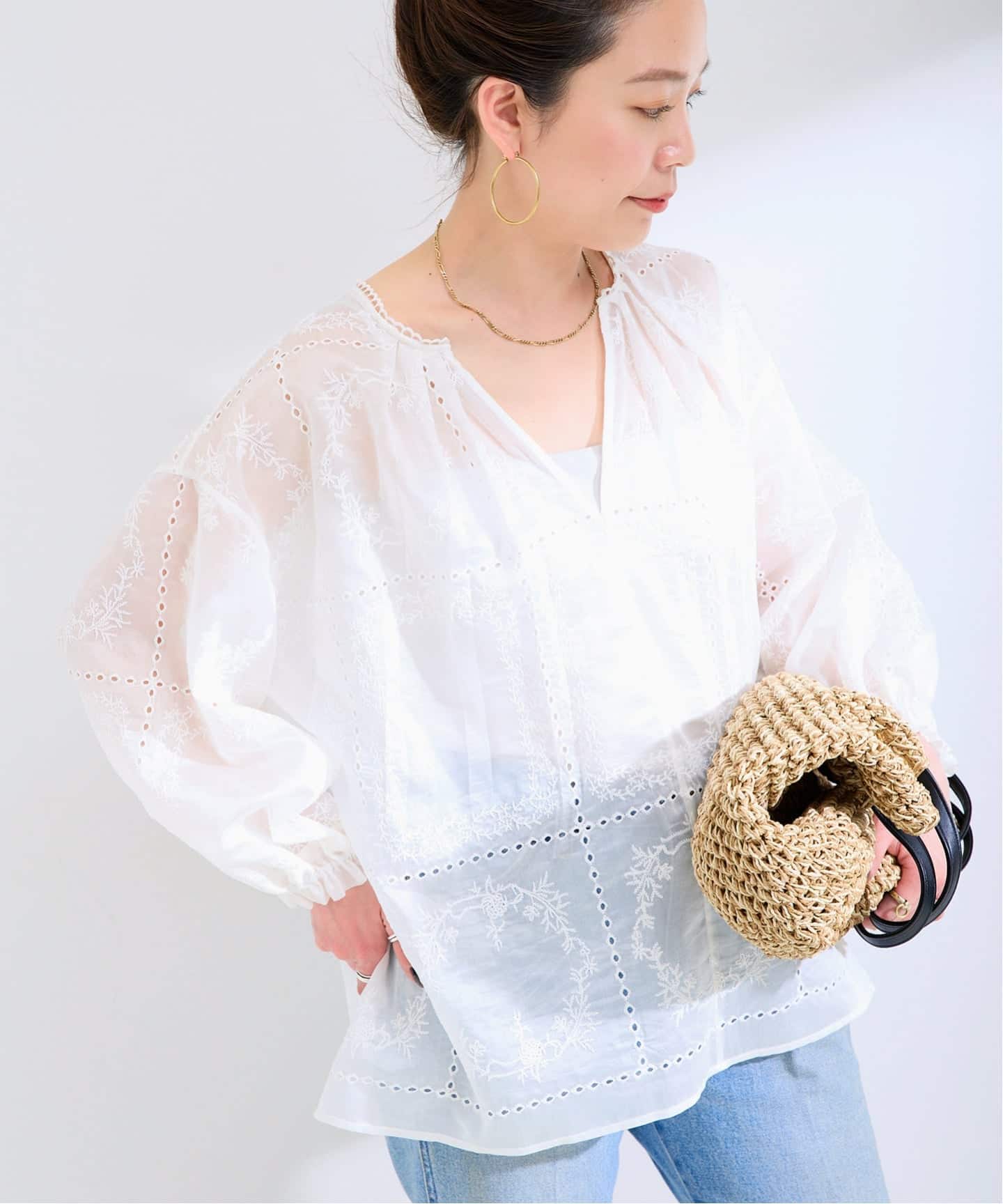 甘すぎないレース編み柄なのでフェミニンにより過ぎないデザインです。