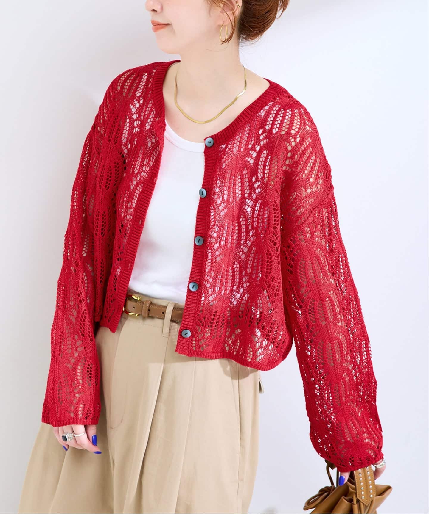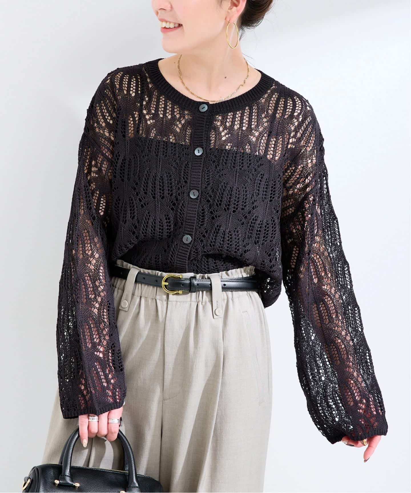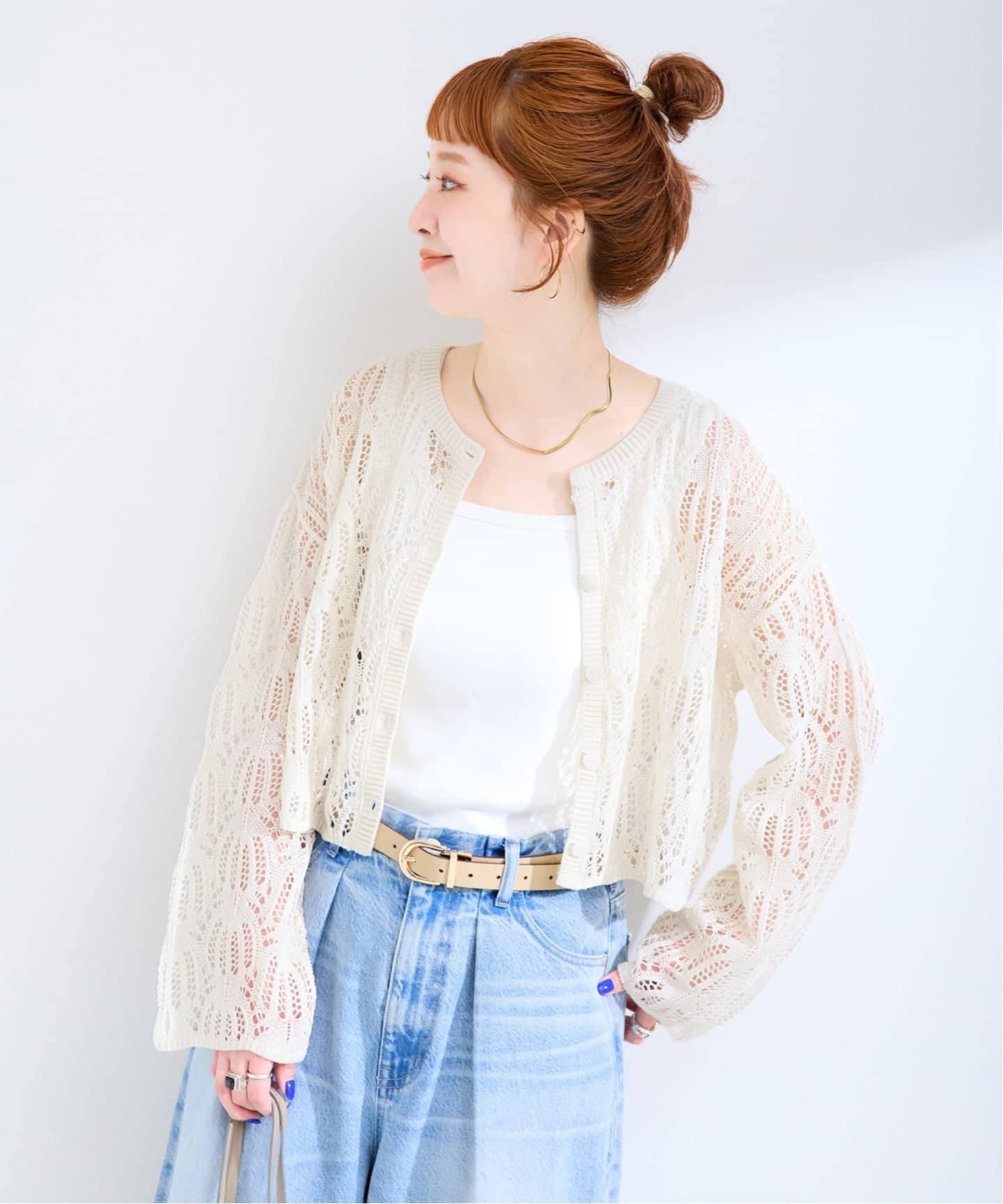 軽量感のあるレース編み地のショート丈カーディガン。