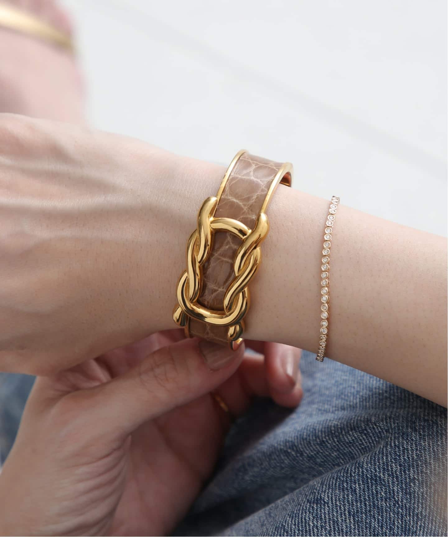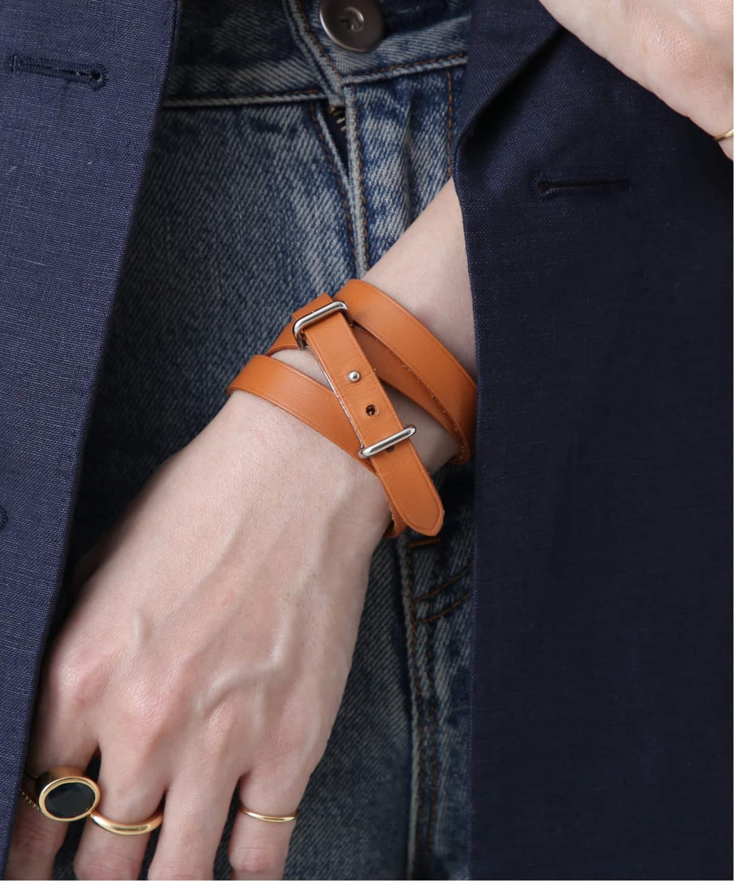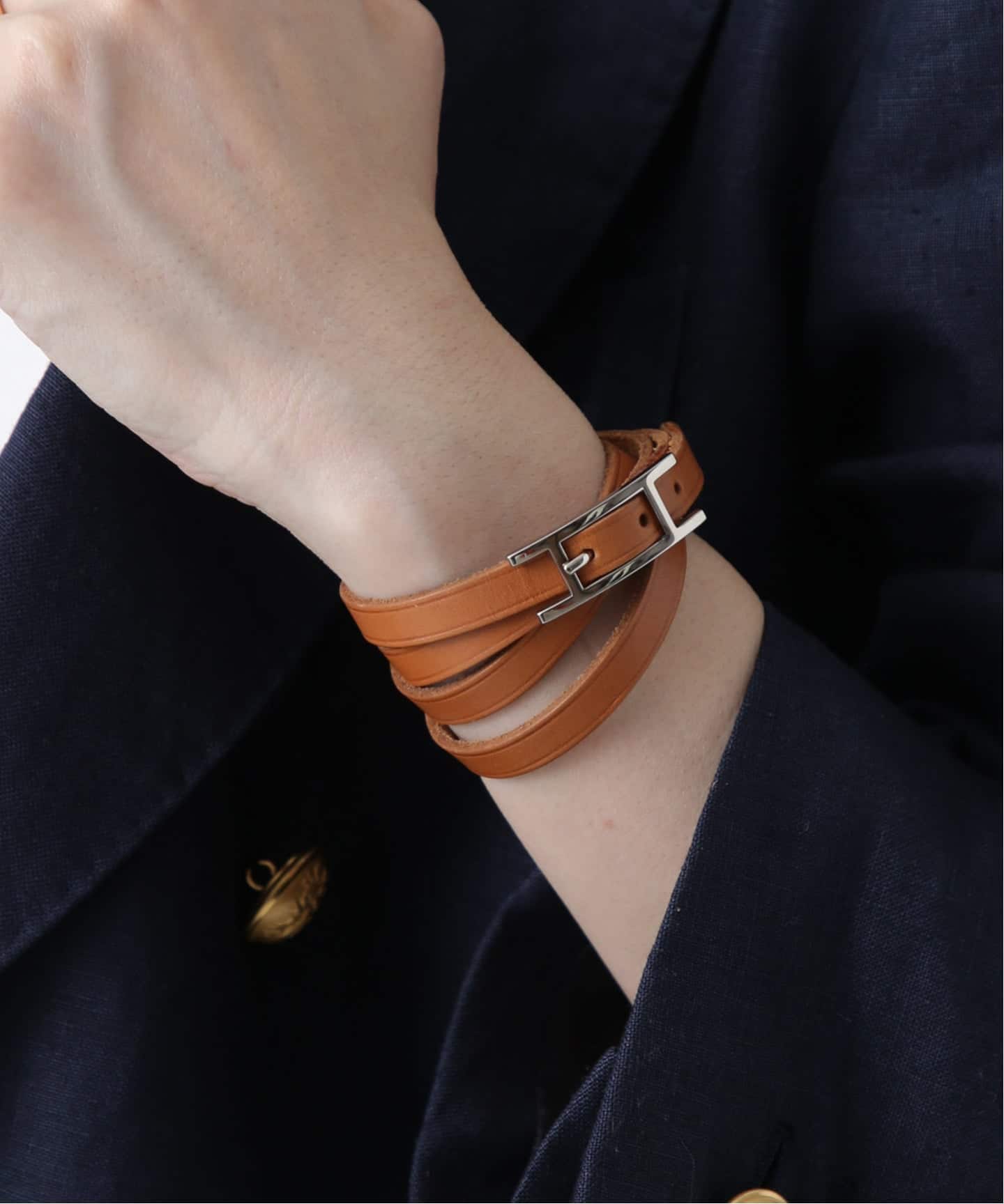 エルメスレザーならではのやわらかな質感。ゴールドレザーは日常にちょうどよく溶け込むところが魅力。スタイルに自然な温度を加え、どこか柔らかなムードへと導く。毎日でも付けたくなるタイムレスなレザーブレス。