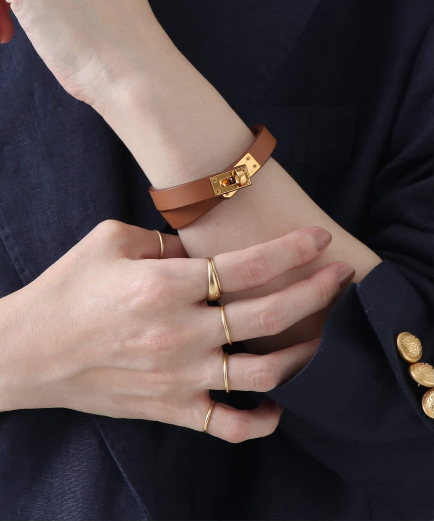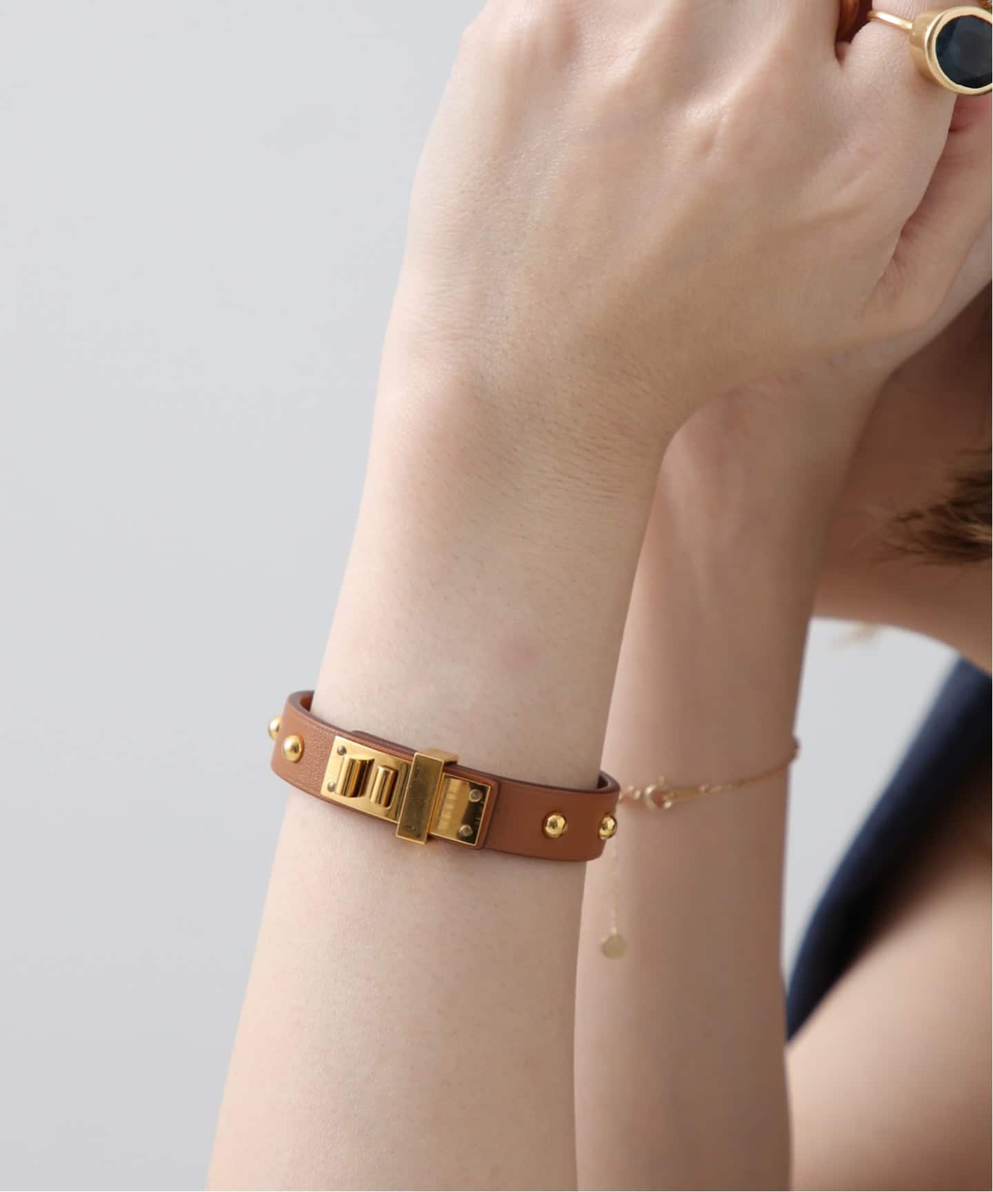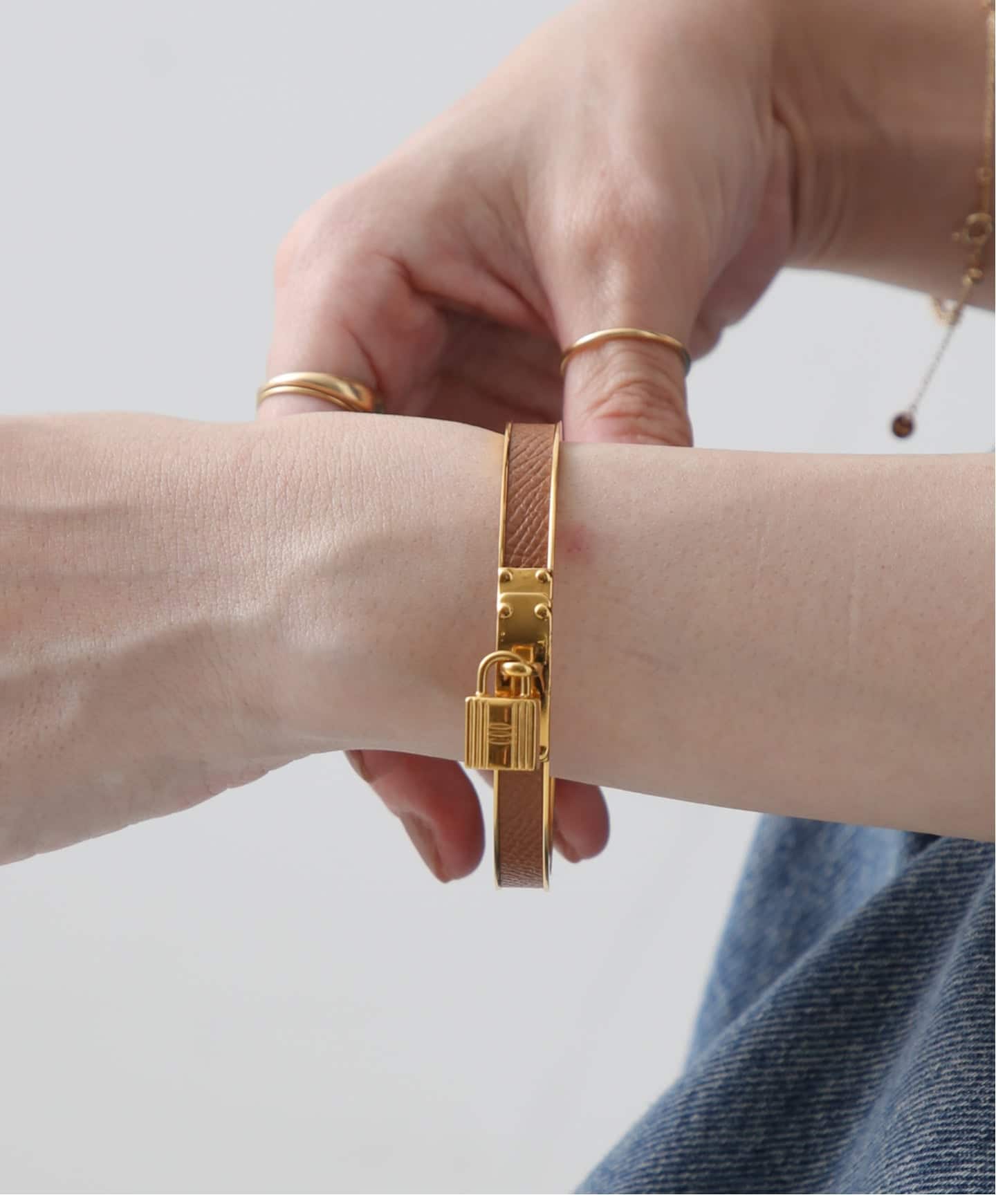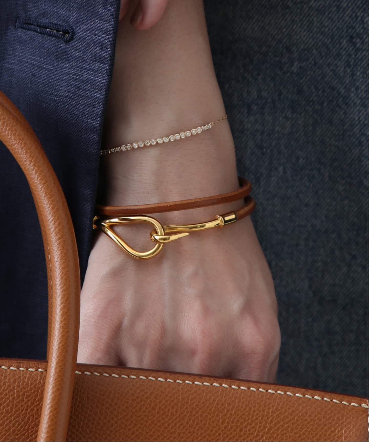 エルメスレザーならではのやわらかな質感。ゴールドレザーは日常にちょうどよく溶け込むところが魅力。スタイルに自然な温度を加え、どこか柔らかなムードへと導く。毎日でも付けたくなるタイムレスなレザーブレス。