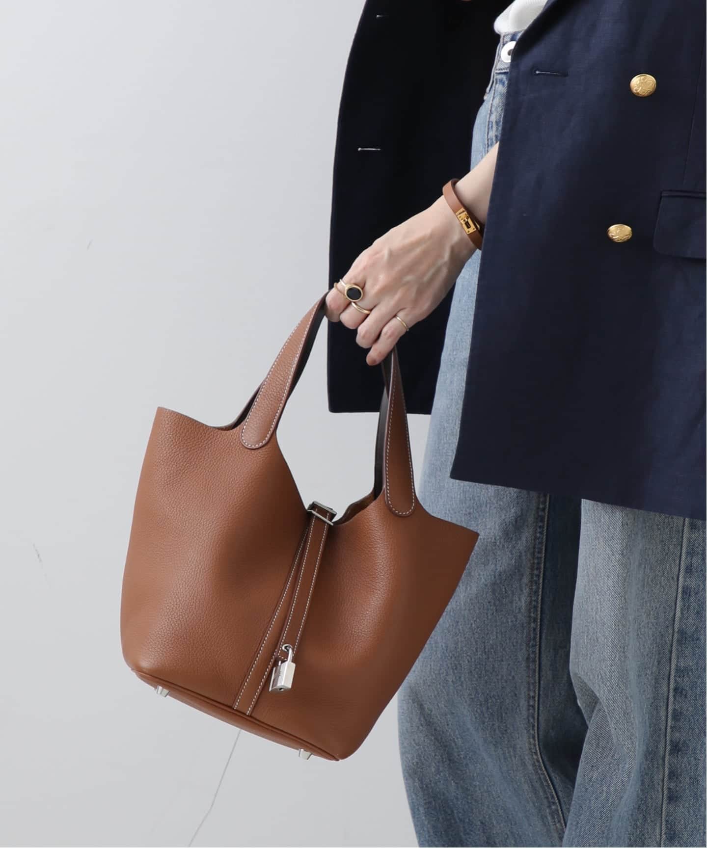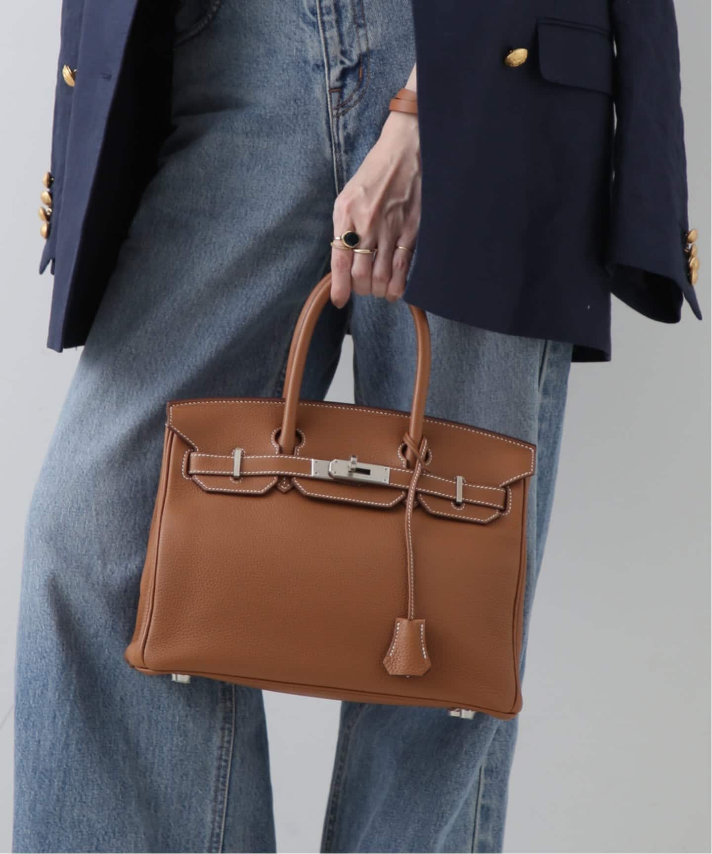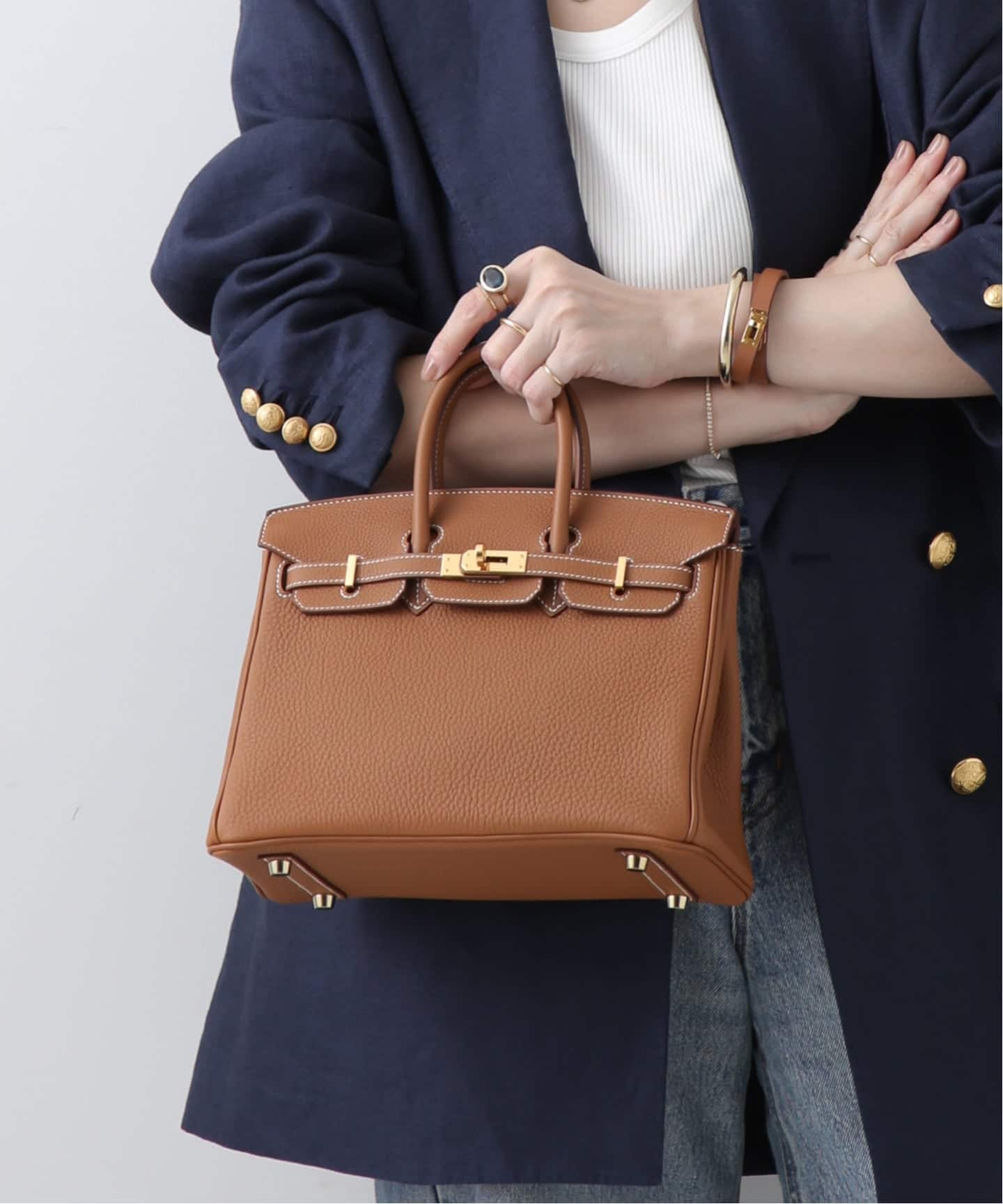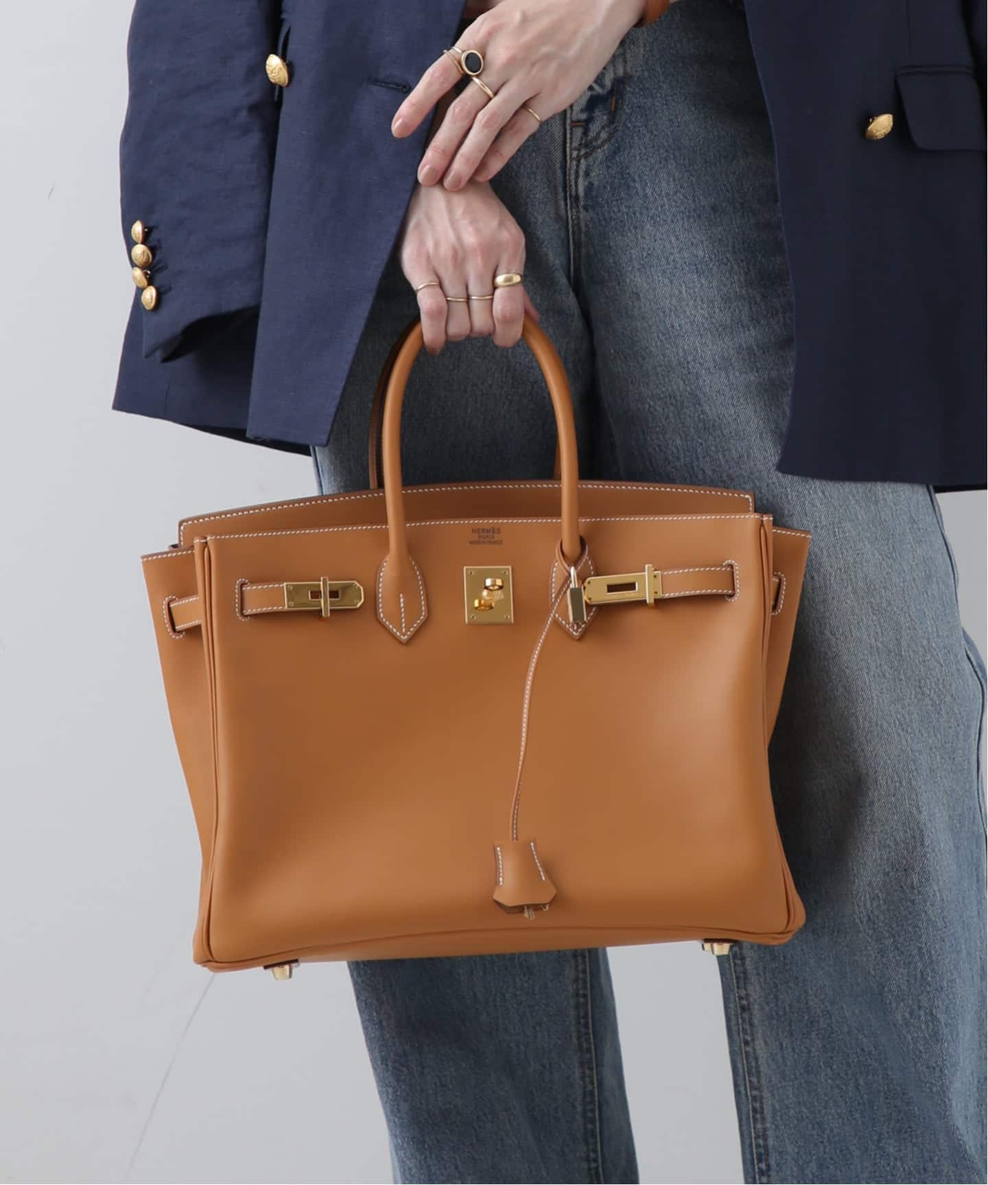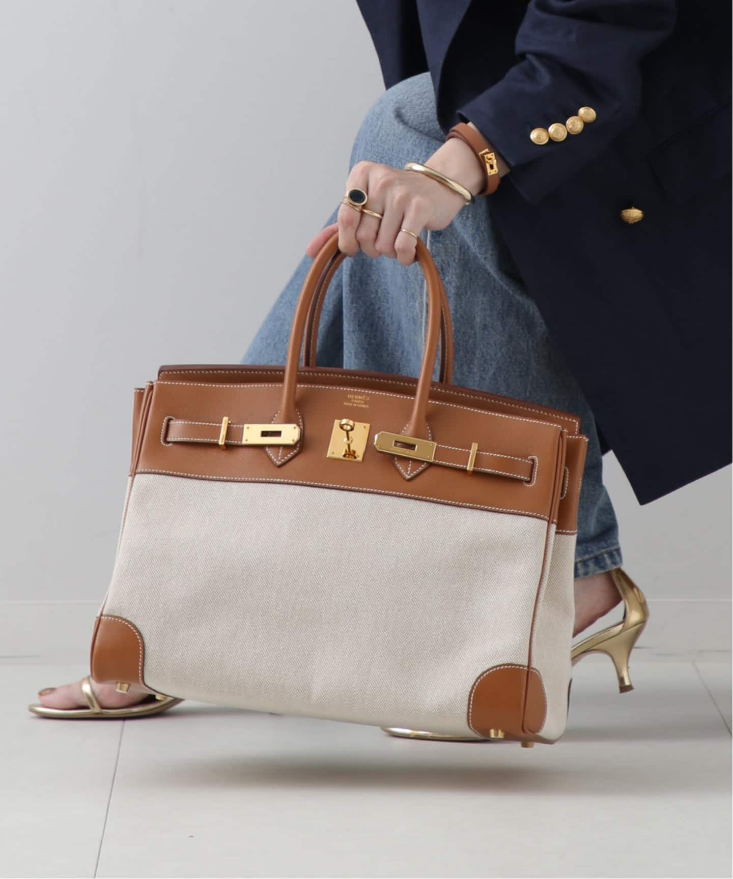 ゴールドレザーの深みと、トワルアッシュのドライな質感が重なった理想的なバランスのバーキン。ボリュームのある35サイズも、キャンバスの抜けによってぐっと軽やかに。トラッドな装いに合わせることで、きちんと感の中に心地よいリラックスが生まれる。これぞまさに大人の余裕。