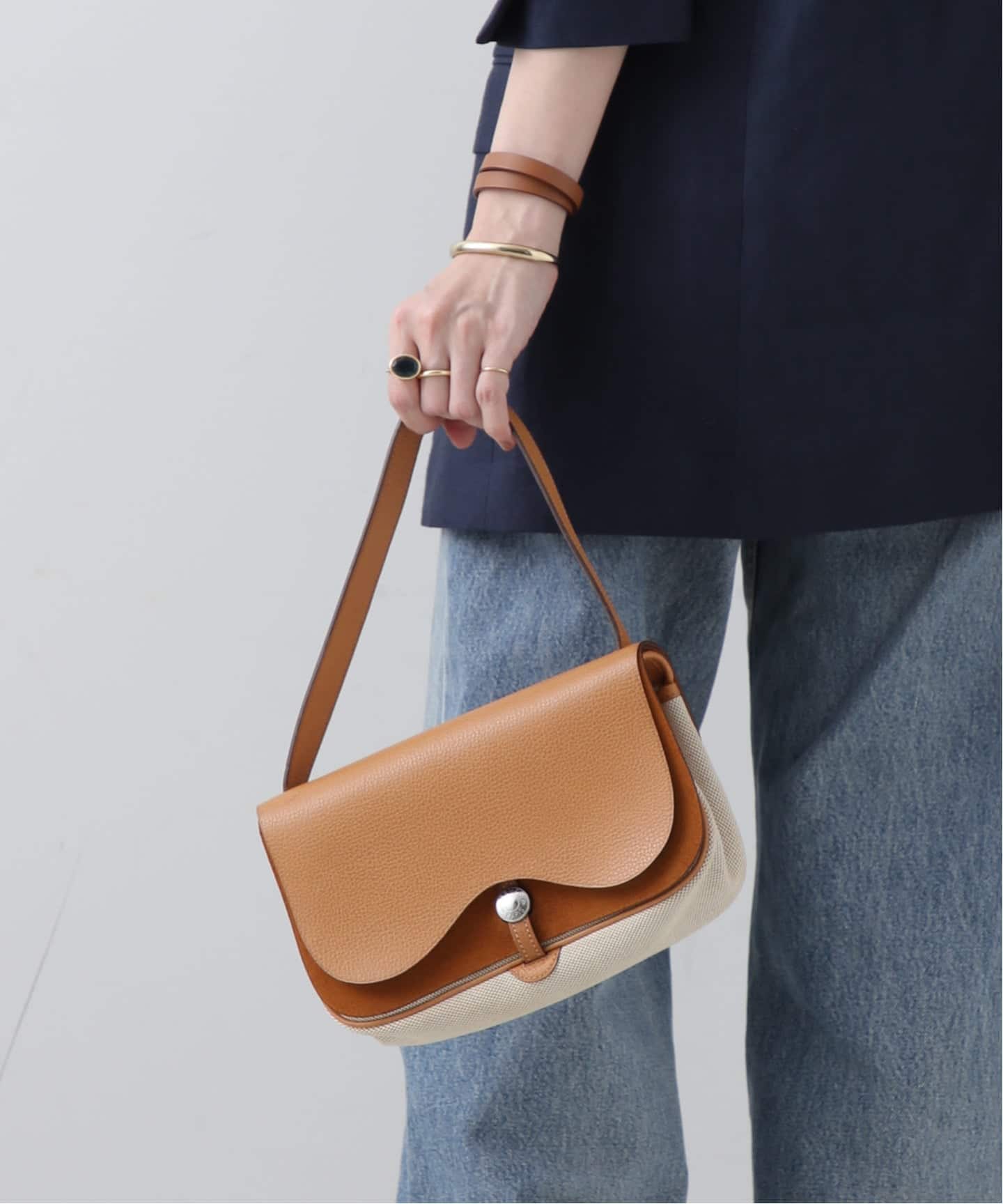 存在感のある35は、あえてラフに持つのが正解。ハリのあるヴァッシュレザーは、構築的で重厚に見えがちだからこそ、リネンやデニムなど、ベーシックでも軽やかさを感じられるスタイリングに合わせて。