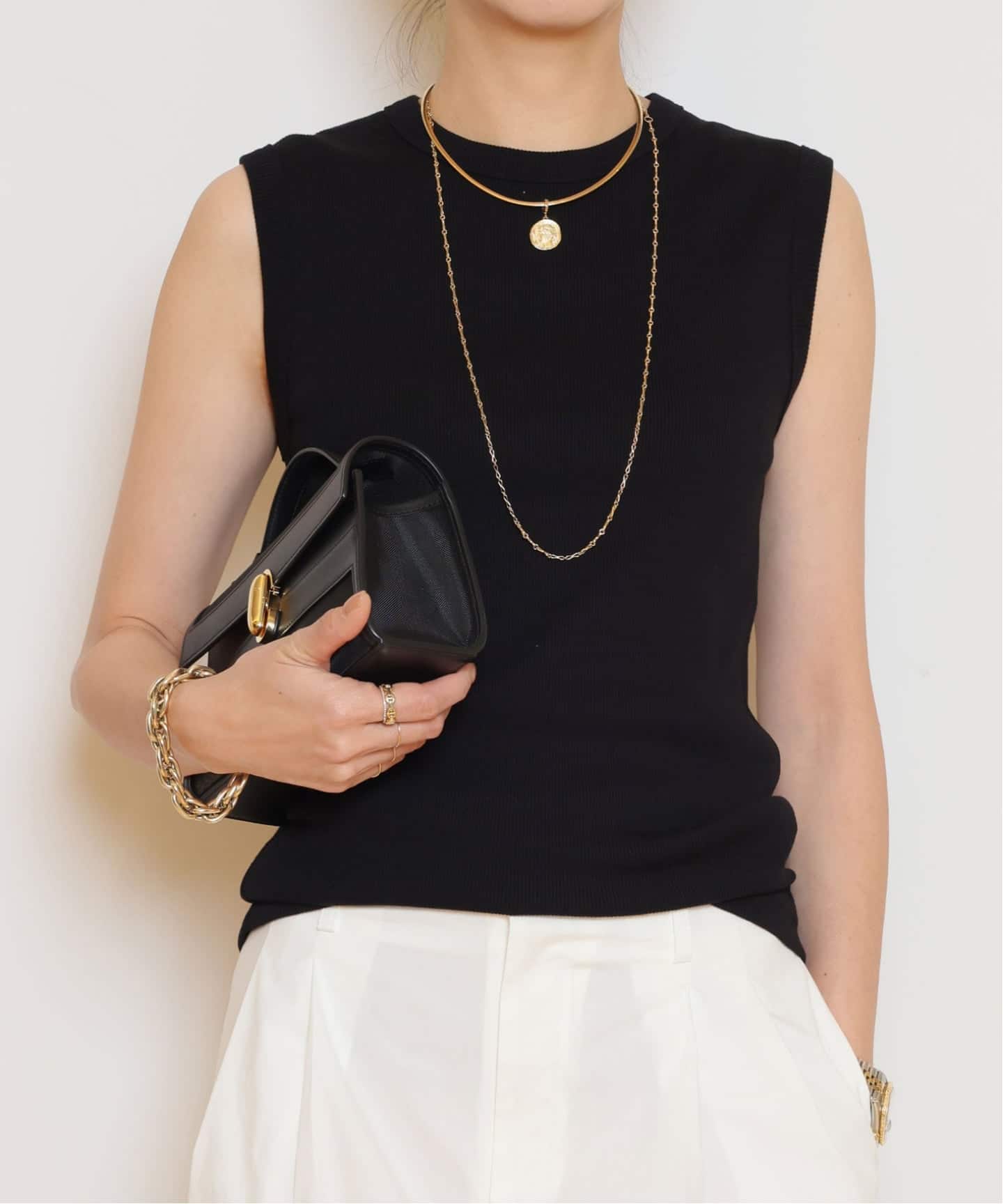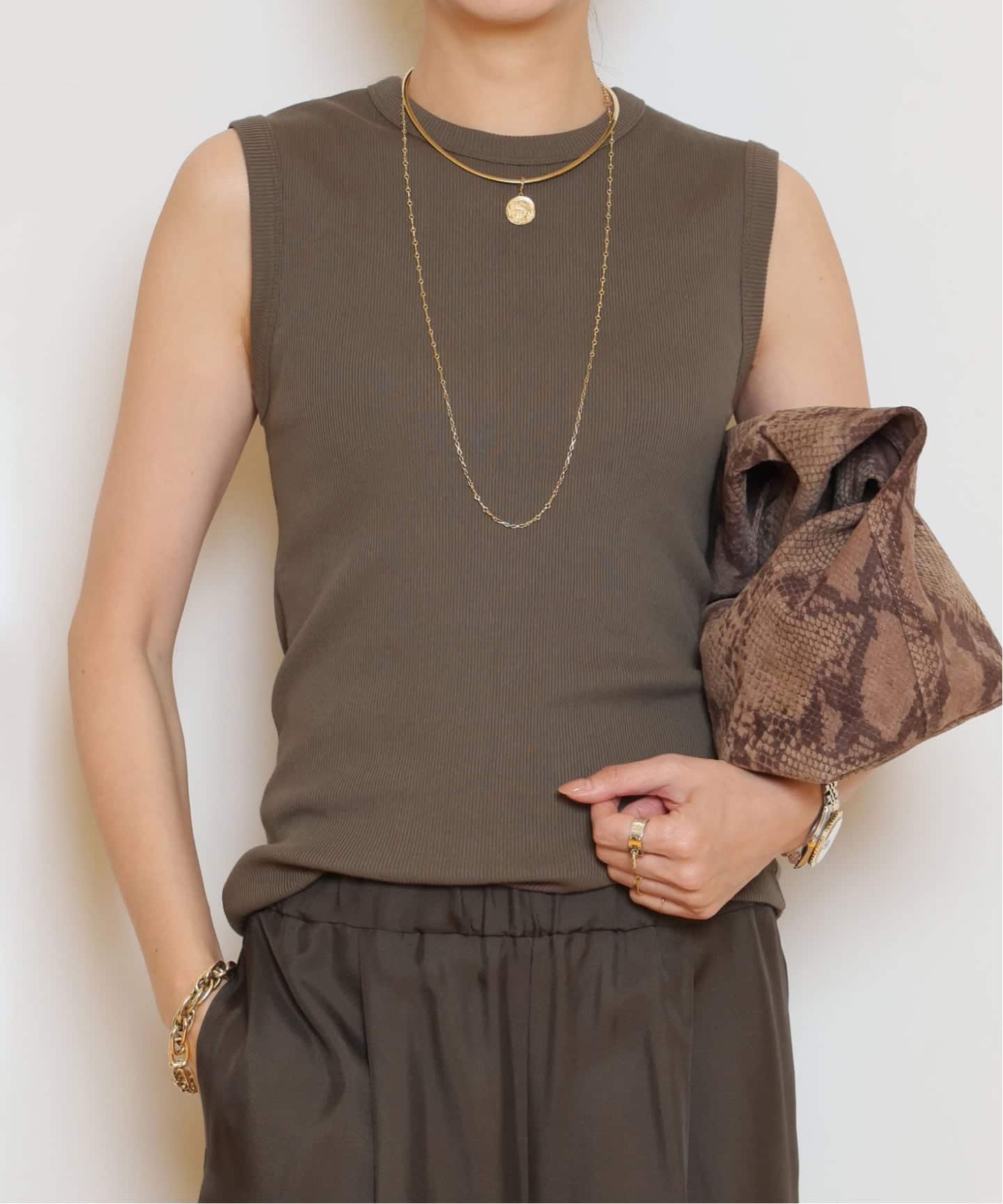 Latest ノースリーブニットは、立体的なリブと肩まわりをすっきり見せる絶妙なカッティングがポイント。