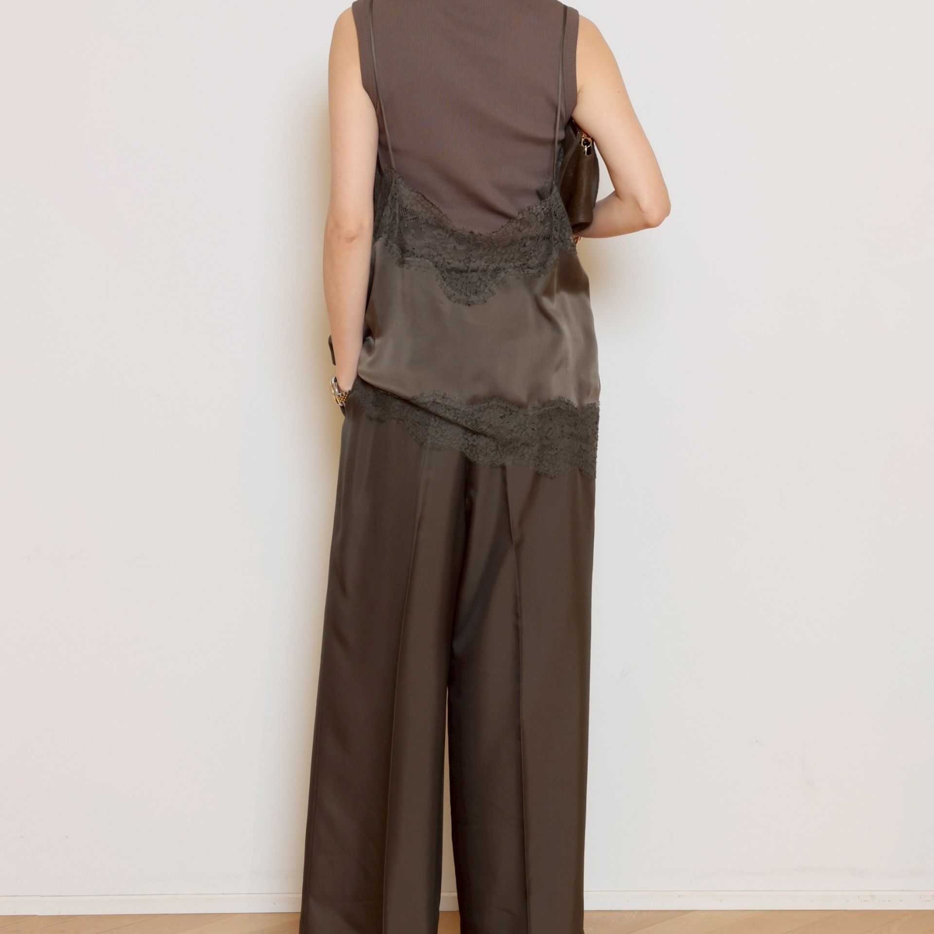 レースも生地に合わせた、美しいブラウンで統一。長く愛せる、いいものを手元に。