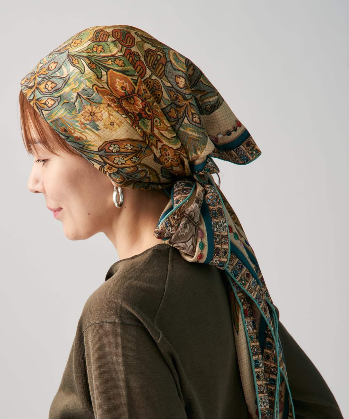 クラシックな柄に、首元のリボンで抜けをつくることで、甘さを抑えたバランスに仕上げています。