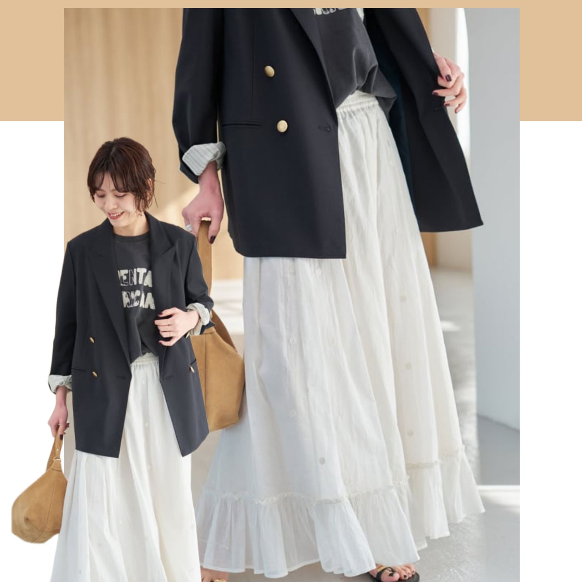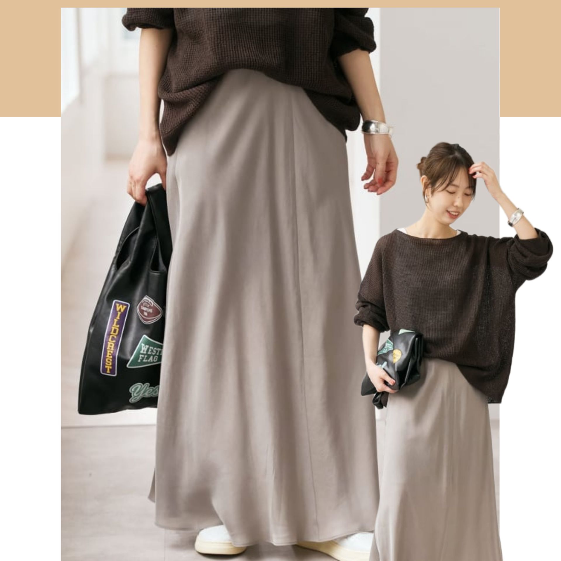 シンプルなトップスと合わせるだけで、今っぽいバランスが完成します。