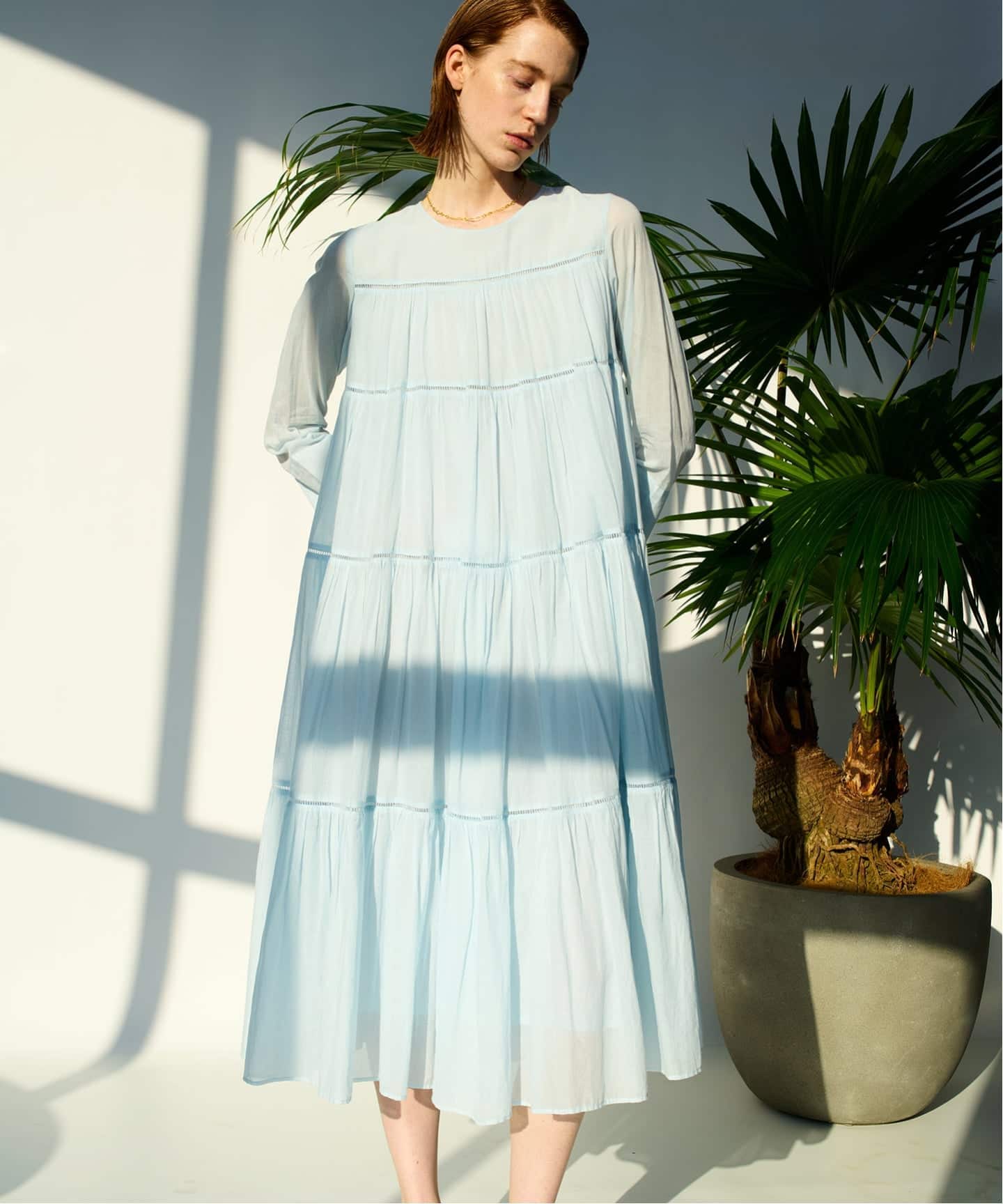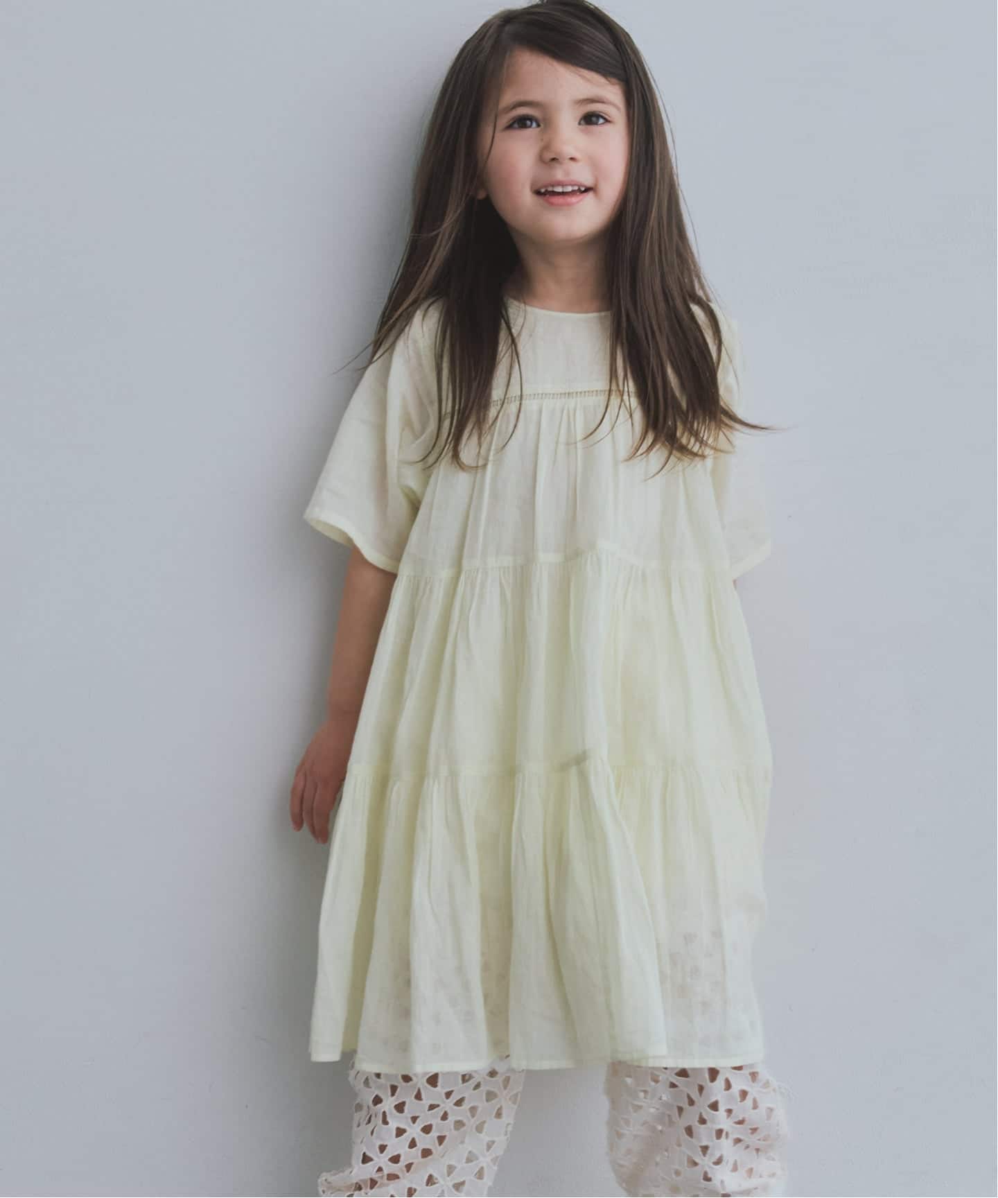 ふんわりと広がるティアードシルエットに、繊細なラダーレースをあしらい、軽やかで抜け感のある一枚に仕上げました。